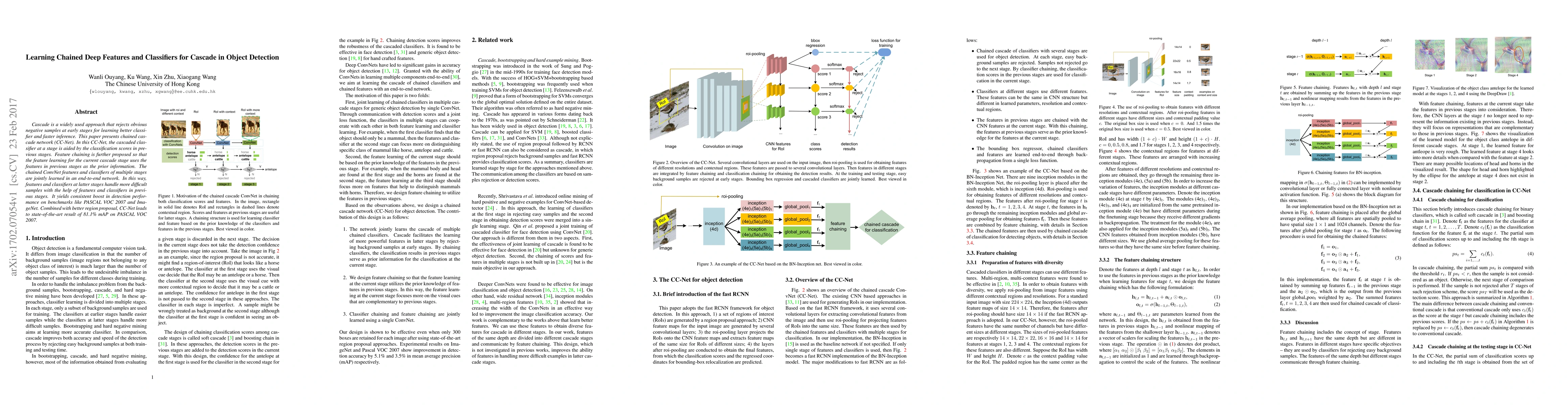 A new object detection approach called Cascade is proposed, which uses chained convolutional neural networks to improve performance. The method achieves state-of-the-art results with a detection accuracy of 81.1% on the PASCAL VOC 2007 benchmark.