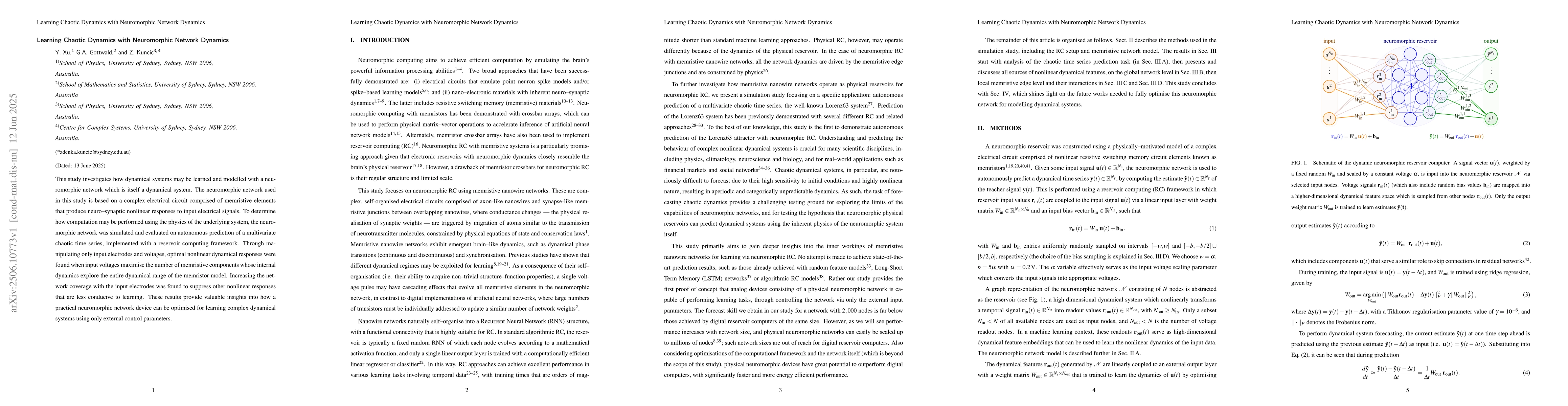 This study investigates how dynamical systems may be learned and modelled with a neuromorphic network which is itself a dynamical system. The neuromorphic network used in this study is based on a complex electrical circuit comprised of memristive elements that produce neuro-synaptic nonlinear responses to input electrical signals. To determine how computation may be performed using the physics of the underlying system, the neuromorphic network was simulated and evaluated on autonomous prediction of a multivariate chaotic time series, implemented with a reservoir computing framework. Through manipulating only input electrodes and voltages, optimal nonlinear dynamical responses were found when input voltages maximise the number of memristive components whose internal dynamics explore the entire dynamical range of the memristor model. Increasing the network coverage with the input electrodes was found to suppress other nonlinear responses that are less conducive to learning. These results provide valuable insights into how a practical neuromorphic network device can be optimised for learning complex dynamical systems using only external control parameters.