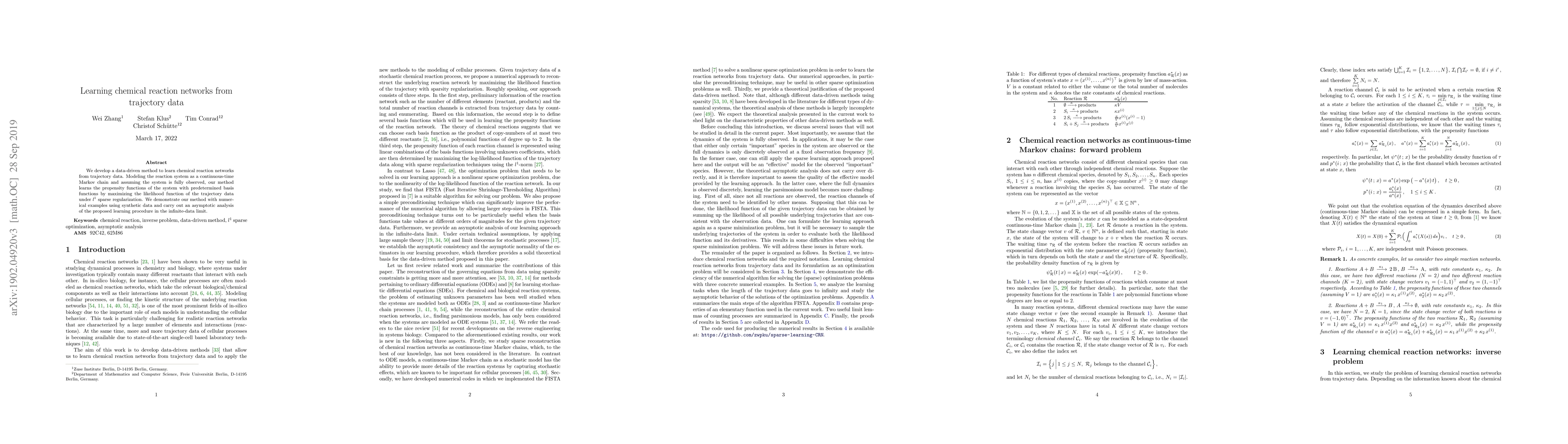 This paper presents a data-driven method to infer chemical reaction networks from trajectory data by modeling the system as a continuous-time Markov chain, employing $l^1$ sparse regularization to learn the propensity functions, and demonstrating its effectiveness through synthetic data and asymptotic analysis.