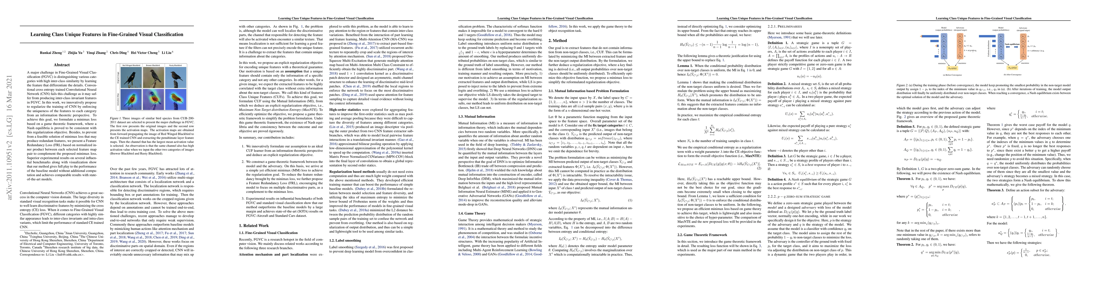 A major challenge in Fine-Grained Visual Classification (FGVC) is distinguishing various categories with high inter-class similarity by learning the feature that differentiate the details. Conventional cross entropy trained Convolutional Neural Network (CNN) fails this challenge as it may suffer from producing inter-class invariant features in FGVC. In this work, we innovatively propose to regularize the training of CNN by enforcing the uniqueness of the features to each category from an information theoretic perspective. To achieve this goal, we formulate a minimax loss based on a game theoretic framework, where a Nash equilibria is proved to be consistent with this regularization objective. Besides, to prevent from a feasible solution of minimax loss that may produce redundant features, we present a Feature Redundancy Loss (FRL) based on normalized inner product between each selected feature map pair to complement the proposed minimax loss. Superior experimental results on several influential benchmarks along with visualization show that our method gives full play to the performance of the baseline model without additional computation and achieves comparable results with state-of-the-art models.