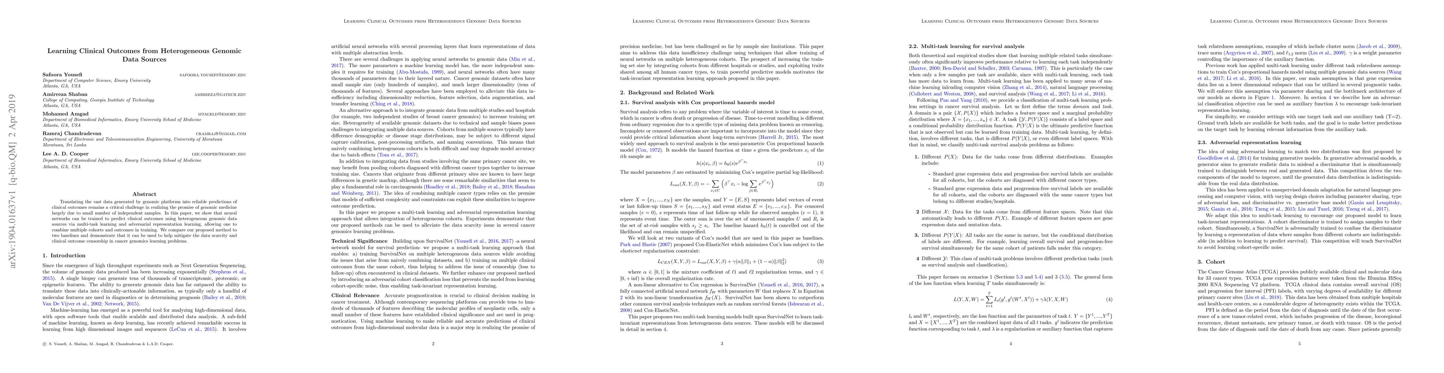 This paper proposes a neural network approach using multi-task learning and adversarial representation learning to predict clinical outcomes from heterogeneous genomic data sources. It demonstrates improved performance over baselines, addressing data scarcity and outcome censorship in cancer genomics.