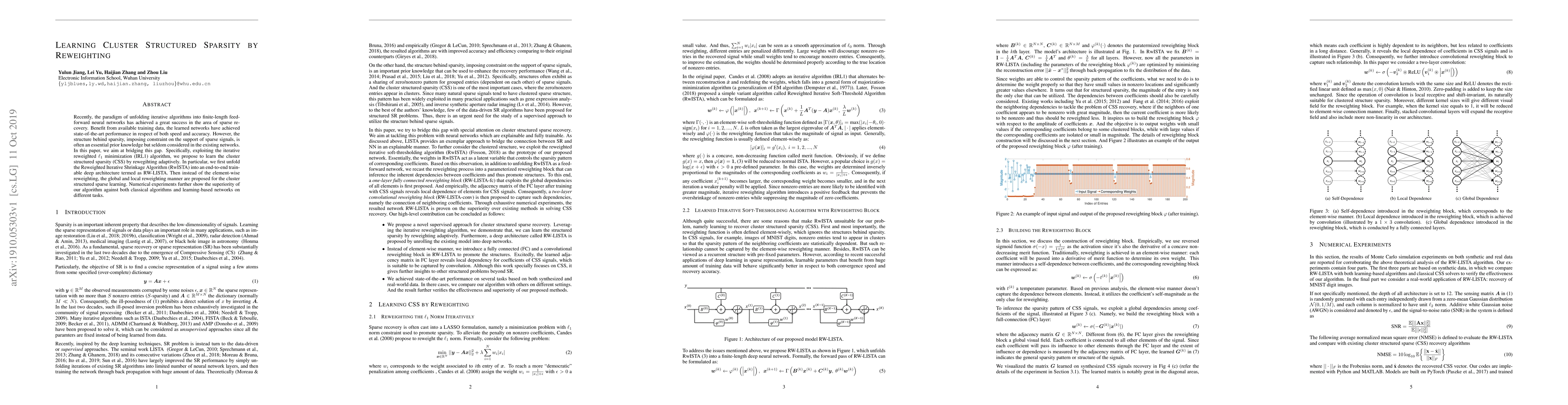 This paper proposes a deep learning approach, RW-LISTA, to learn cluster structured sparsity by adaptively reweighting, addressing the gap in existing networks that overlook structural sparsity. The method outperforms classical and other learning-based networks in terms of speed and accuracy across various tasks.