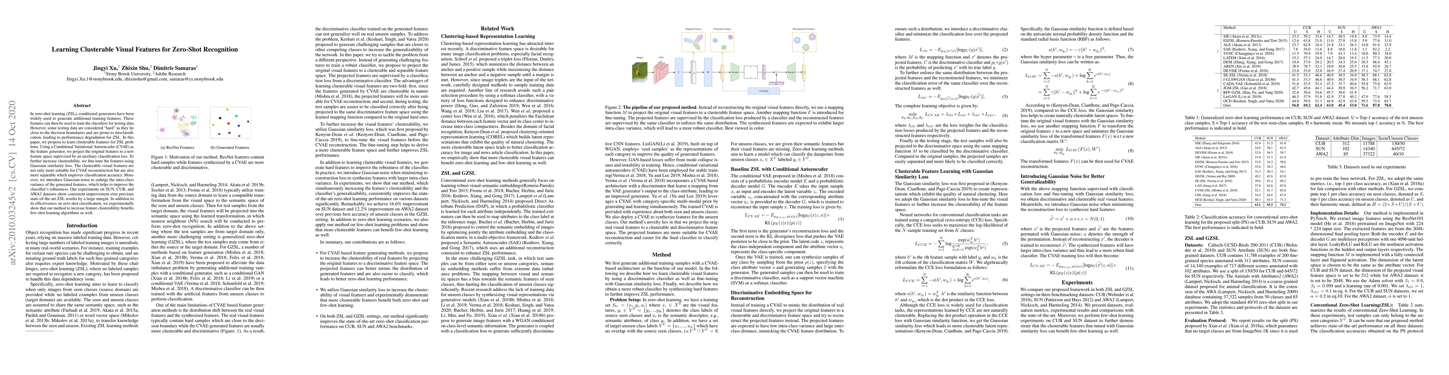 This paper proposes learning clusterable visual features for zero-shot recognition using a Conditional Variational Autoencoder (CVAE) and Gaussian similarity loss to enhance feature separability and classifier robustness, achieving significant improvements over previous methods on multiple datasets. The method also benefits few-shot learning algorithms.