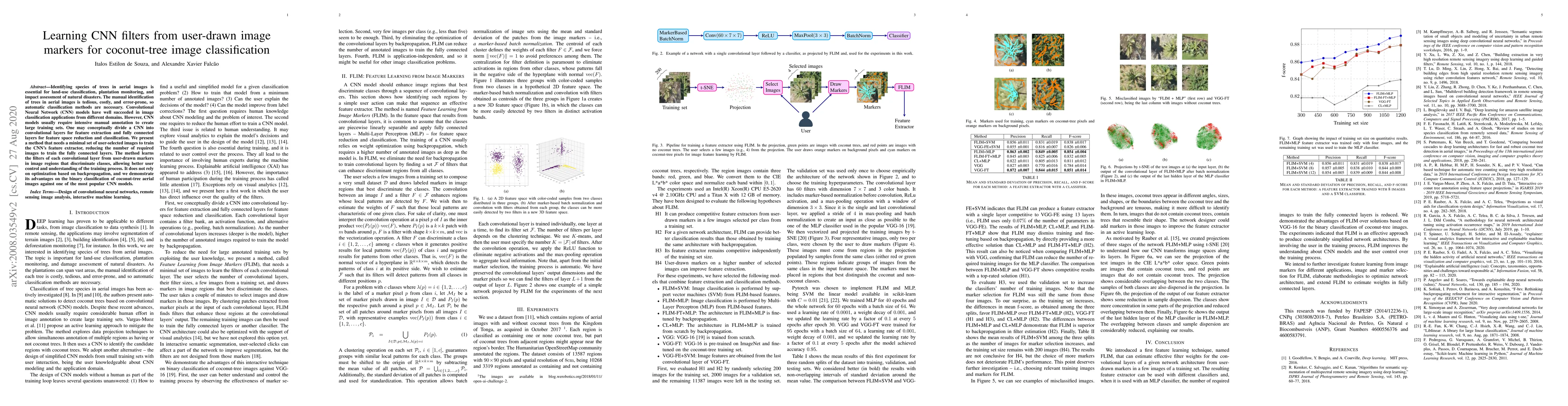 Identifying species of trees in aerial images is essential for land-use classification, plantation monitoring, and impact assessment of natural disasters. The manual identification of trees in aerial images is tedious, costly, and error-prone, so automatic classification methods are necessary. Convolutional Neural Network (CNN) models have well succeeded in image classification applications from different domains. However, CNN models usually require intensive manual annotation to create large training sets. One may conceptually divide a CNN into convolutional layers for feature extraction and fully connected layers for feature space reduction and classification. We present a method that needs a minimal set of user-selected images to train the CNN's feature extractor, reducing the number of required images to train the fully connected layers. The method learns the filters of each convolutional layer from user-drawn markers in image regions that discriminate classes, allowing better user control and understanding of the training process. It does not rely on optimization based on backpropagation, and we demonstrate its advantages on the binary classification of coconut-tree aerial images against one of the most popular CNN models.