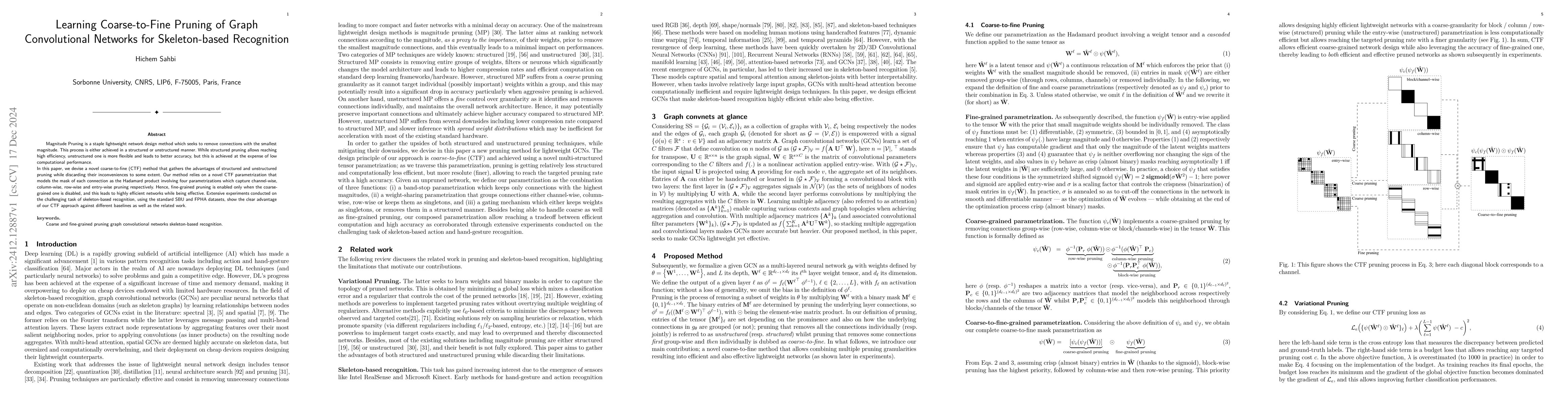 This paper introduces a novel coarse-to-fine pruning method for graph convolutional networks aimed at skeleton-based recognition, achieving high efficiency and accuracy by combining structured and unstructured pruning strategies. The method uses a CTF parametrization to enable fine-grained pruning, demonstrating superior performance on SBU and FPHA datasets.