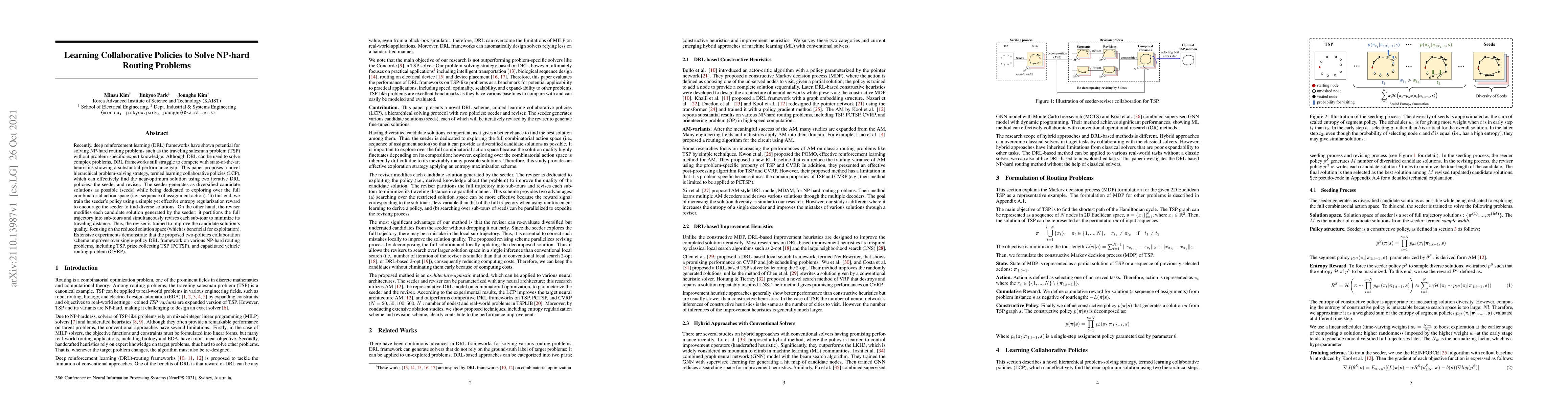 This paper introduces a hierarchical deep reinforcement learning strategy called learning collaborative policies (LCP) to solve NP-hard routing problems. It employs two DRL policies—the seeder to explore diverse solutions and the reviser to refine them—demonstrating improved performance over single-policy DRL frameworks on problems like TSP, PCTSP, and CVRP.