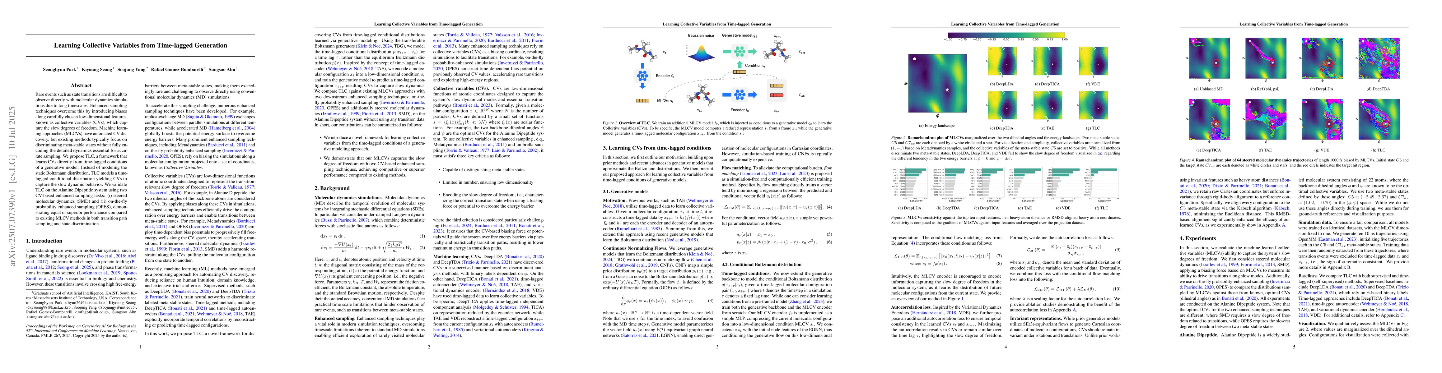 Rare events such as state transitions are difficult to observe directly with molecular dynamics simulations due to long timescales. Enhanced sampling techniques overcome this by introducing biases along carefully chosen low-dimensional features, known as collective variables (CVs), which capture the slow degrees of freedom. Machine learning approaches (MLCVs) have automated CV discovery, but existing methods typically focus on discriminating meta-stable states without fully encoding the detailed dynamics essential for accurate sampling. We propose TLC, a framework that learns CVs directly from time-lagged conditions of a generative model. Instead of modeling the static Boltzmann distribution, TLC models a time-lagged conditional distribution yielding CVs to capture the slow dynamic behavior. We validate TLC on the Alanine Dipeptide system using two CV-based enhanced sampling tasks: (i) steered molecular dynamics (SMD) and (ii) on-the-fly probability enhanced sampling (OPES), demonstrating equal or superior performance compared to existing MLCV methods in both transition path sampling and state discrimination.