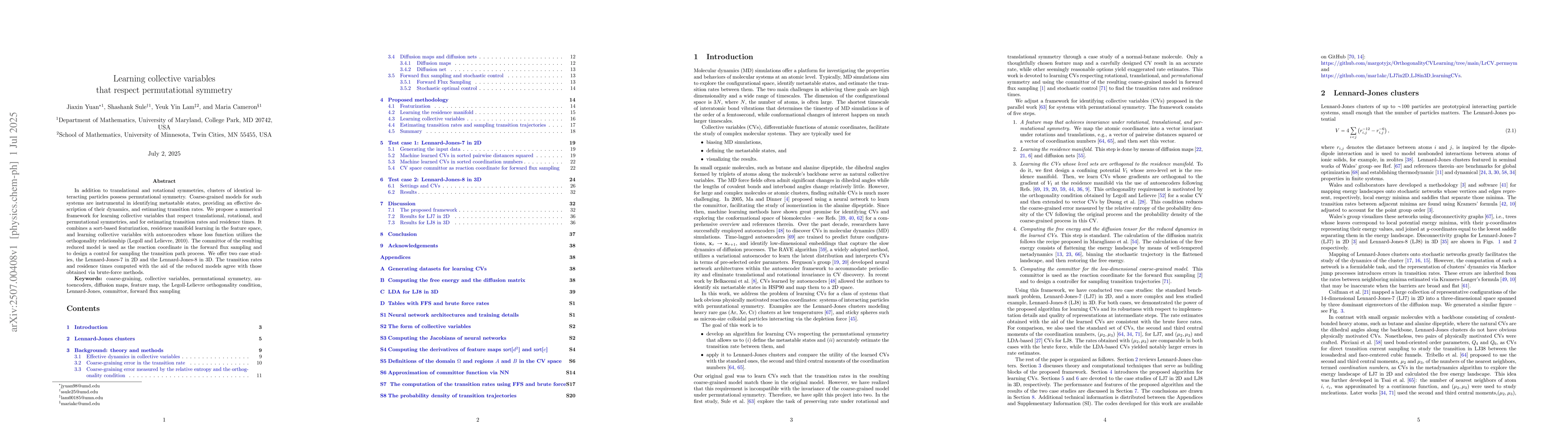 In addition to translational and rotational symmetries, clusters of identical interacting particles possess permutational symmetry. Coarse-grained models for such systems are instrumental in identifying metastable states, providing an effective description of their dynamics, and estimating transition rates. We propose a numerical framework for learning collective variables that respect translational, rotational, and permutational symmetries, and for estimating transition rates and residence times. It combines a sort-based featurization, residence manifold learning in the feature space, and learning collective variables with autoencoders whose loss function utilizes the orthogonality relationship (Legoll and Lelievre, 2010). The committor of the resulting reduced model is used as the reaction coordinate in the forward flux sampling and to design a control for sampling the transition path process. We offer two case studies, the Lennard-Jones-7 in 2D and the Lennard-Jones-8 in 3D. The transition rates and residence times computed with the aid of the reduced models agree with those obtained via brute-force methods.