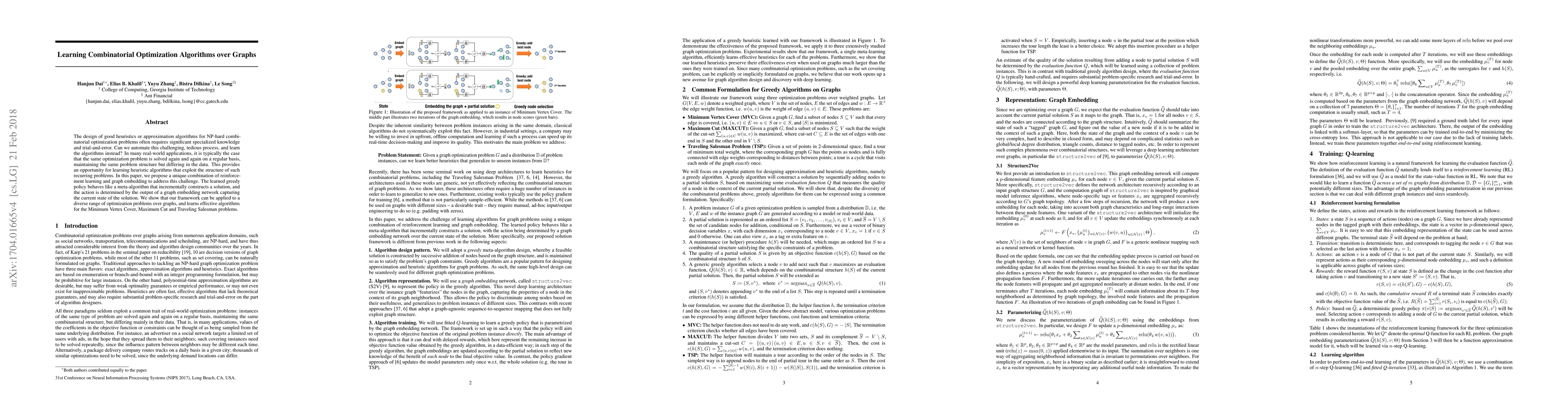 The design of good heuristics or approximation algorithms for NP-hard combinatorial optimization problems often requires significant specialized knowledge and trial-and-error. Can we automate this challenging, tedious process, and learn the algorithms instead? In many real-world applications, it is typically the case that the same optimization problem is solved again and again on a regular basis, maintaining the same problem structure but differing in the data. This provides an opportunity for learning heuristic algorithms that exploit the structure of such recurring problems. In this paper, we propose a unique combination of reinforcement learning and graph embedding to address this challenge. The learned greedy policy behaves like a meta-algorithm that incrementally constructs a solution, and the action is determined by the output of a graph embedding network capturing the current state of the solution. We show that our framework can be applied to a diverse range of optimization problems over graphs, and learns effective algorithms for the Minimum Vertex Cover, Maximum Cut and Traveling Salesman problems.