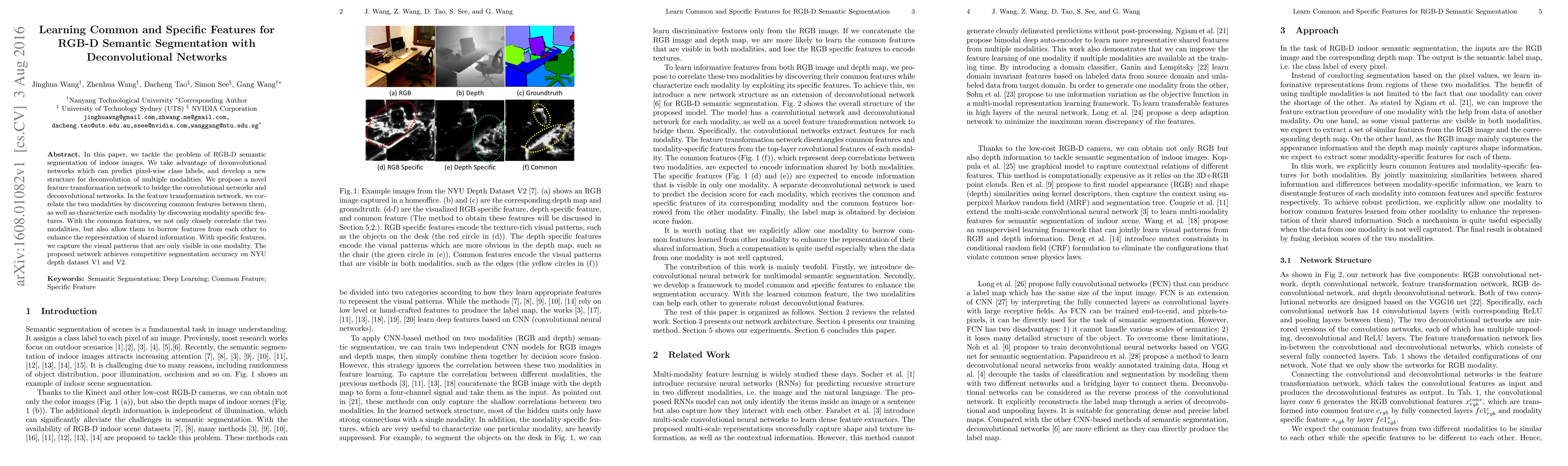 This paper proposes a deconvolutional network for RGB-D semantic segmentation, introducing a feature transformation network to correlate and differentiate common and specific features from RGB and depth modalities, achieving high segmentation accuracy on NYU depth datasets.
