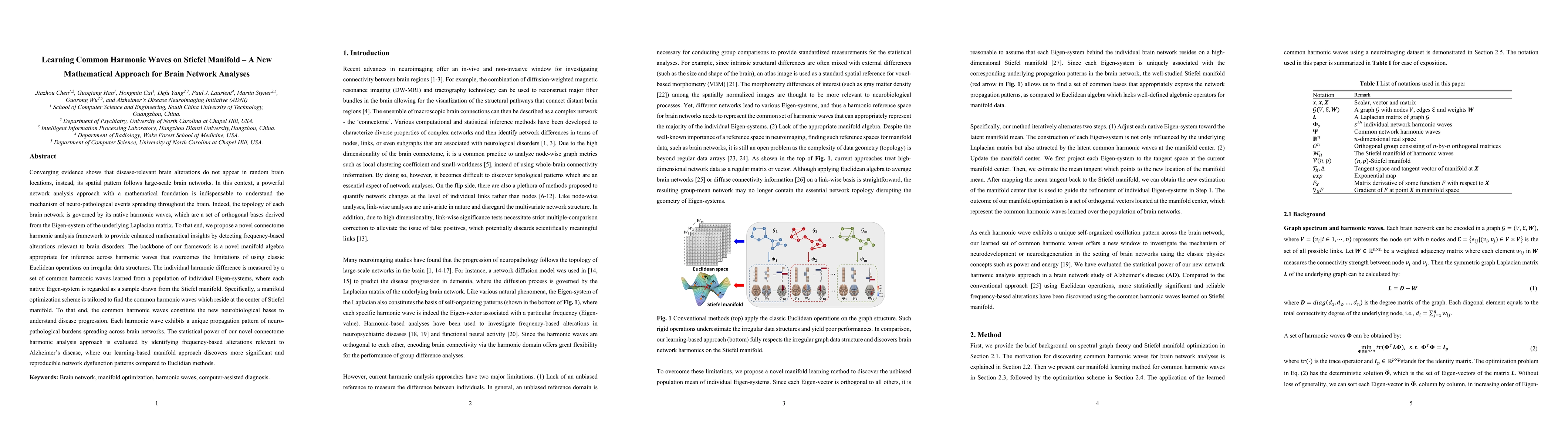 This paper proposes a novel mathematical framework for brain network analysis using common harmonic waves on the Stiefel manifold to detect frequency-based alterations relevant to brain disorders. The approach identifies common harmonic waves from population Eigen-systems, offering enhanced insights into disease progression compared to traditional Euclidean methods, as demonstrated through its application to Alzheimer's disease.