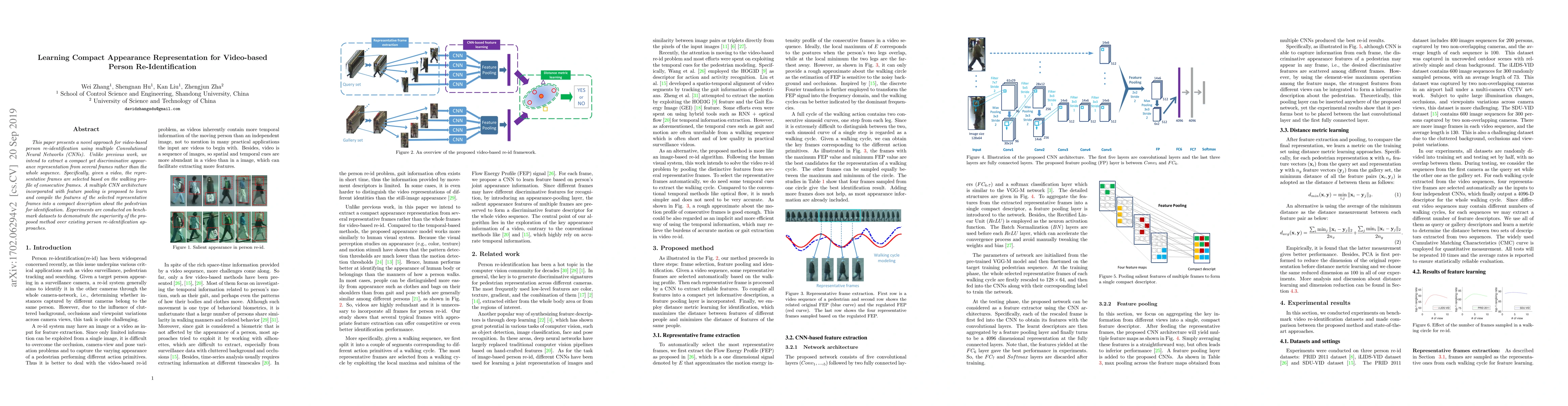 This paper introduces a method for video-based person re-identification using multiple CNNs to extract a compact and discriminative appearance representation from selected frames based on walking profiles. The proposed multiple CNN architecture with feature pooling outperforms existing methods on benchmark datasets.