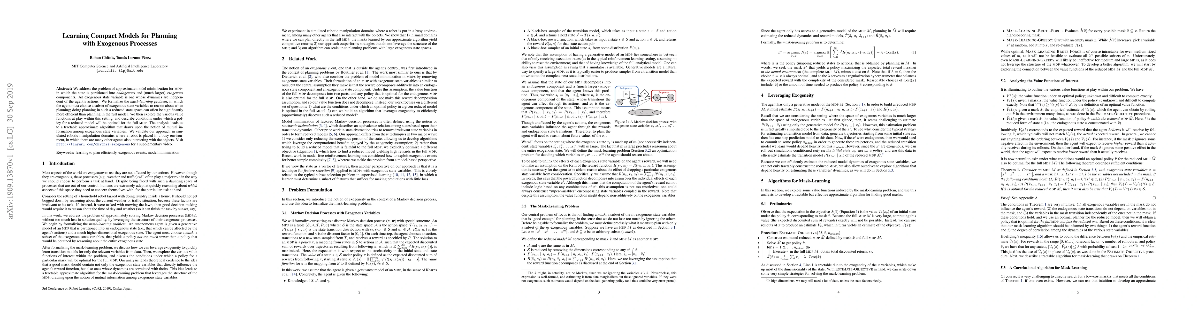 We address the problem of approximate model minimization for MDPs in which the state is partitioned into endogenous and (much larger) exogenous components. An exogenous state variable is one whose dynamics are independent of the agent's actions. We formalize the mask-learning problem, in which the agent must choose a subset of exogenous state variables to reason about when planning; doing planning in such a reduced state space can often be significantly more efficient than planning in the full model. We then explore the various value functions at play within this setting, and describe conditions under which a policy for a reduced model will be optimal for the full MDP. The analysis leads us to a tractable approximate algorithm that draws upon the notion of mutual information among exogenous state variables. We validate our approach in simulated robotic manipulation domains where a robot is placed in a busy environment, in which there are many other agents also interacting with the objects. Visit http://tinyurl.com/chitnis-exogenous for a supplementary video.