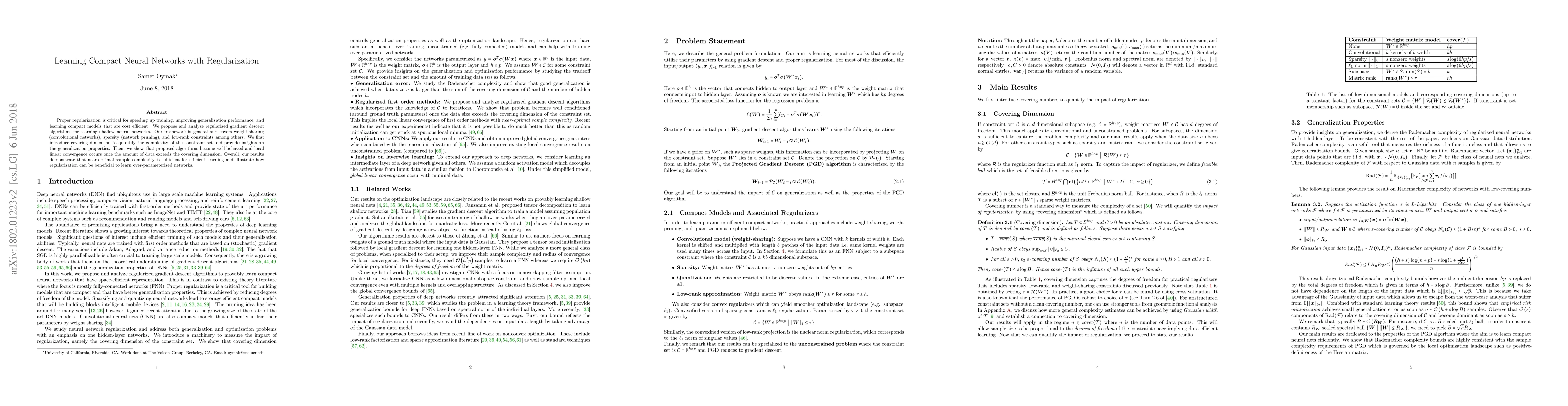 Proper regularization is critical for speeding up training, improving generalization performance, and learning compact models that are cost efficient. We propose and analyze regularized gradient descent algorithms for learning shallow neural networks. Our framework is general and covers weight-sharing (convolutional networks), sparsity (network pruning), and low-rank constraints among others. We first introduce covering dimension to quantify the complexity of the constraint set and provide insights on the generalization properties. Then, we show that proposed algorithms become well-behaved and local linear convergence occurs once the amount of data exceeds the covering dimension. Overall, our results demonstrate that near-optimal sample complexity is sufficient for efficient learning and illustrate how regularization can be beneficial to learn over-parameterized networks.