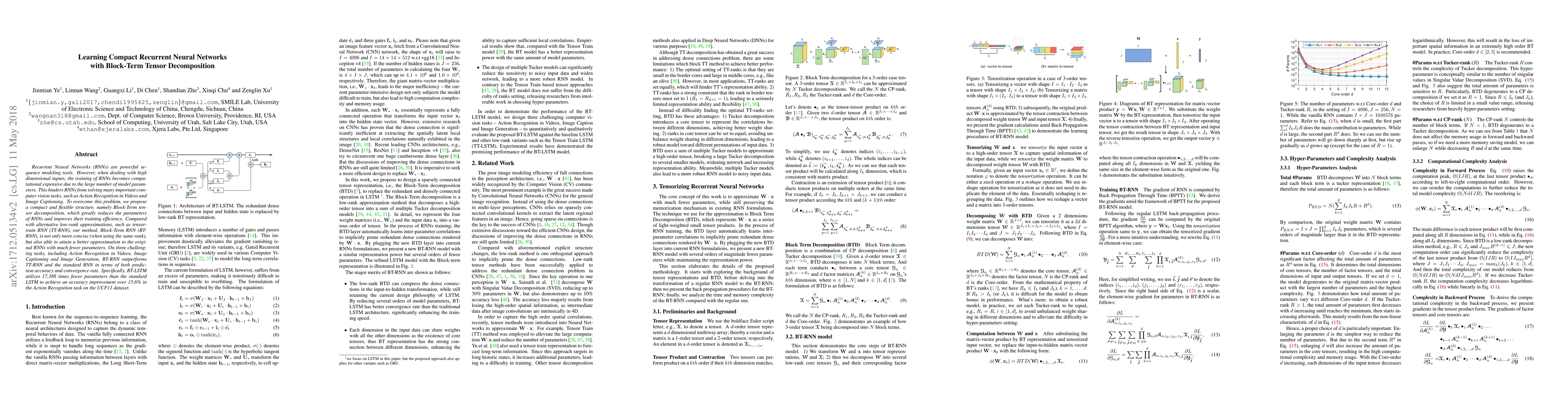 Recurrent Neural Networks (RNNs) are powerful sequence modeling tools. However, when dealing with high dimensional inputs, the training of RNNs becomes computational expensive due to the large number of model parameters. This hinders RNNs from solving many important computer vision tasks, such as Action Recognition in Videos and Image Captioning. To overcome this problem, we propose a compact and flexible structure, namely Block-Term tensor decomposition, which greatly reduces the parameters of RNNs and improves their training efficiency. Compared with alternative low-rank approximations, such as tensor-train RNN (TT-RNN), our method, Block-Term RNN (BT-RNN), is not only more concise (when using the same rank), but also able to attain a better approximation to the original RNNs with much fewer parameters. On three challenging tasks, including Action Recognition in Videos, Image Captioning and Image Generation, BT-RNN outperforms TT-RNN and the standard RNN in terms of both prediction accuracy and convergence rate. Specifically, BT-LSTM utilizes 17,388 times fewer parameters than the standard LSTM to achieve an accuracy improvement over 15.6\% in the Action Recognition task on the UCF11 dataset.