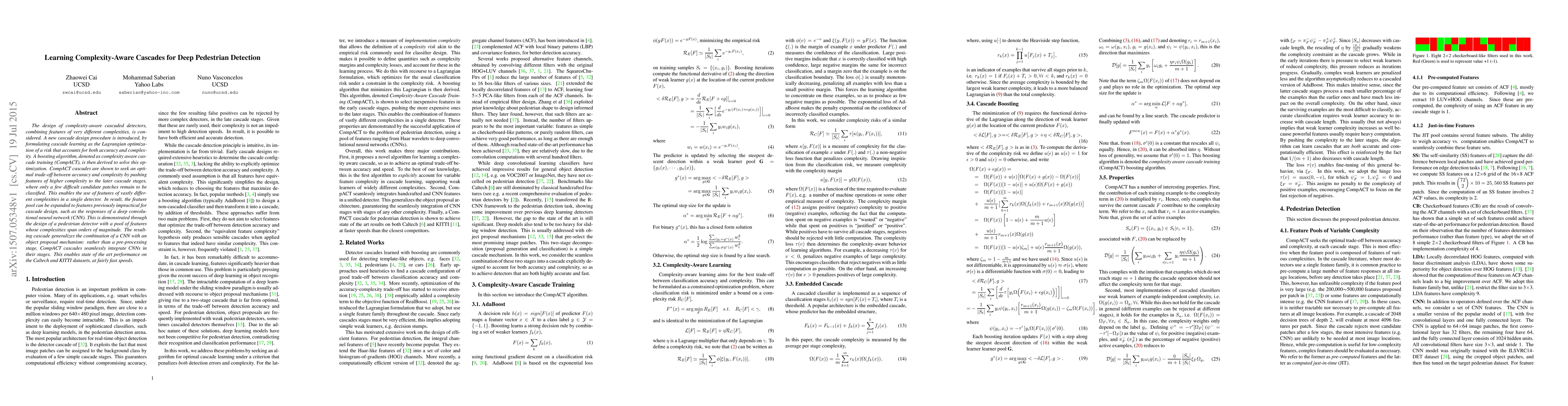 This research introduces a novel complexity-aware cascade design for deep pedestrian detection, optimizing both accuracy and complexity through a Lagrangian optimization approach. The proposed CompACT algorithm effectively integrates features of varying complexities, including deep CNN responses, into a single detector, achieving state-of-the-art performance on Caltech and KITTI datasets while maintaining speed.
