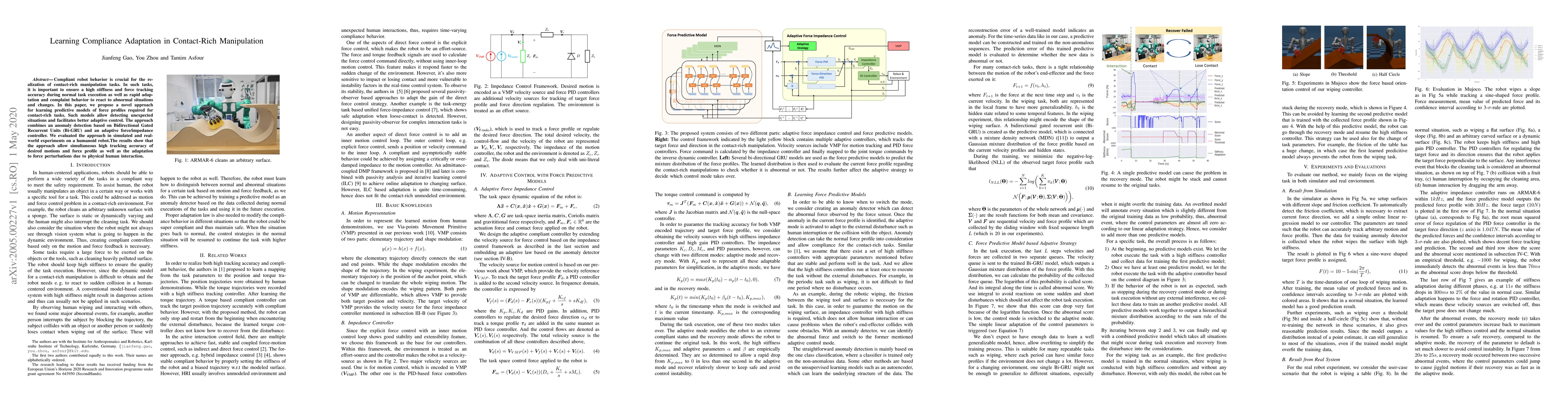 This paper proposes a novel approach for learning predictive models of force profiles to enable compliant robot behavior in contact-rich manipulation tasks. It combines Bi-GRU-based anomaly detection and an adaptive force/impedance controller, demonstrating high tracking accuracy and rapid adaptation to unexpected situations in both simulated and real-world experiments.
