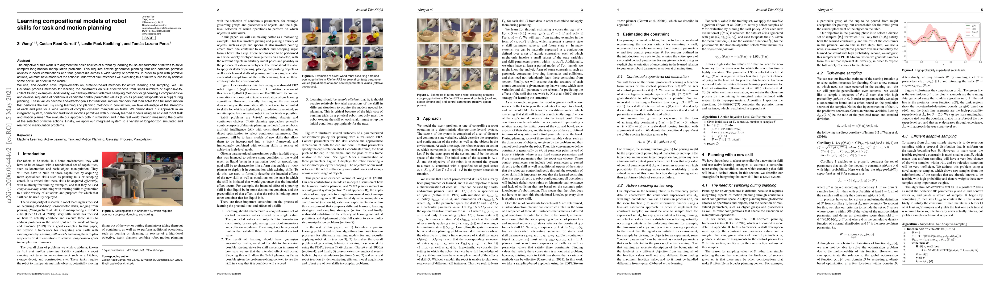 The objective of this work is to augment the basic abilities of a robot by learning to use sensorimotor primitives to solve complex long-horizon manipulation problems. This requires flexible generative planning that can combine primitive abilities in novel combinations and thus generalize across a wide variety of problems. In order to plan with primitive actions, we must have models of the actions: under what circumstances will executing this primitive successfully achieve some particular effect in the world? We use, and develop novel improvements on, state-of-the-art methods for active learning and sampling. We use Gaussian process methods for learning the constraints on skill effectiveness from small numbers of expensive-to-collect training examples. Additionally, we develop efficient adaptive sampling methods for generating a comprehensive and diverse sequence of continuous candidate control parameter values (such as pouring waypoints for a cup) during planning. These values become end-effector goals for traditional motion planners that then solve for a full robot motion that performs the skill. By using learning and planning methods in conjunction, we take advantage of the strengths of each and plan for a wide variety of complex dynamic manipulation tasks. We demonstrate our approach in an integrated system, combining traditional robotics primitives with our newly learned models using an efficient robot task and motion planner. We evaluate our approach both in simulation and in the real world through measuring the quality of the selected primitive actions. Finally, we apply our integrated system to a variety of long-horizon simulated and real-world manipulation problems.