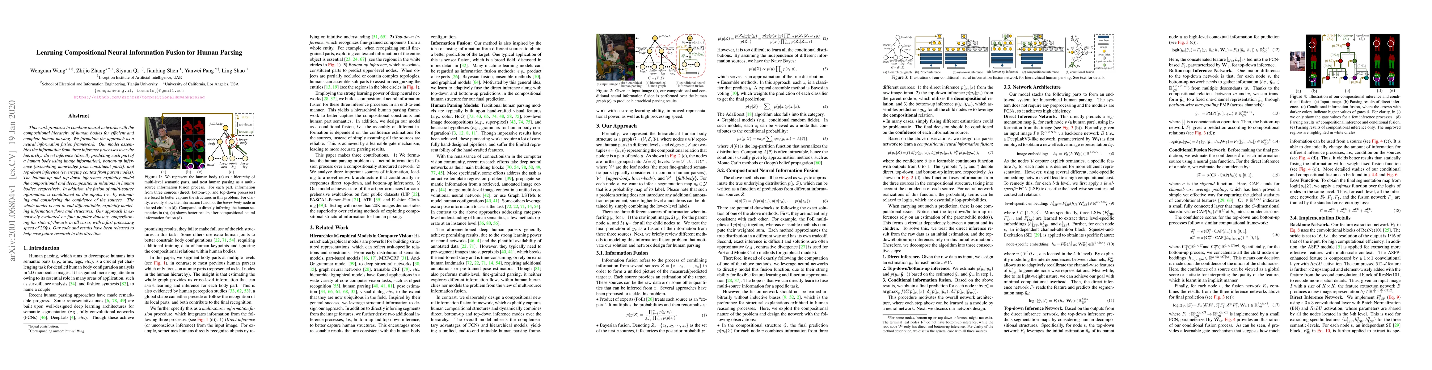 This work proposes to combine neural networks with the compositional hierarchy of human bodies for efficient and complete human parsing. We formulate the approach as a neural information fusion framework. Our model assembles the information from three inference processes over the hierarchy: direct inference (directly predicting each part of a human body using image information), bottom-up inference (assembling knowledge from constituent parts), and top-down inference (leveraging context from parent nodes). The bottom-up and top-down inferences explicitly model the compositional and decompositional relations in human bodies, respectively. In addition, the fusion of multi-source information is conditioned on the inputs, i.e., by estimating and considering the confidence of the sources. The whole model is end-to-end differentiable, explicitly modeling information flows and structures. Our approach is extensively evaluated on four popular datasets, outperforming the state-of-the-arts in all cases, with a fast processing speed of 23fps. Our code and results have been released to help ease future research in this direction.