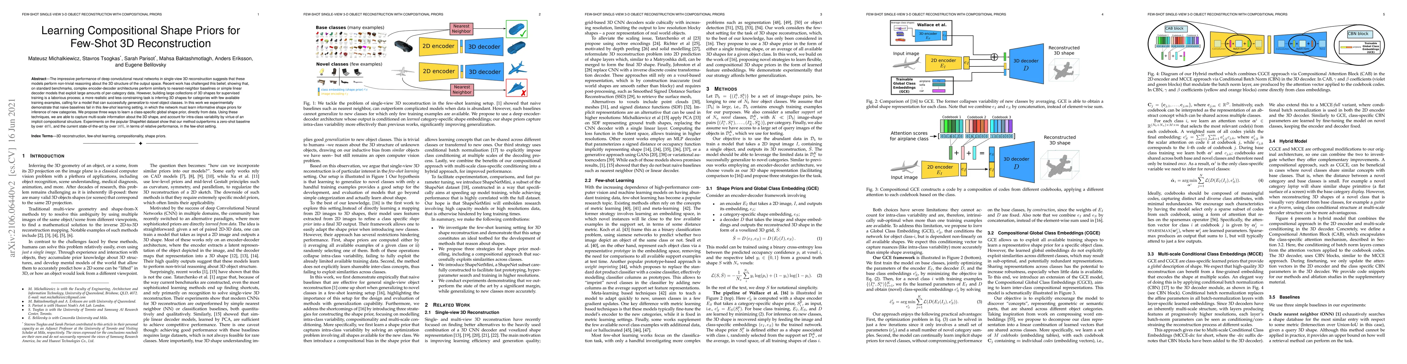 This paper proposes methods to learn compositional shape priors for few-shot 3D reconstruction, demonstrating that traditional baselines fail in this setting. The authors introduce techniques to capture multi-scale shape information and intra-class variability, achieving superior performance on the ShapeNet dataset compared to zero-shot and state-of-the-art methods.