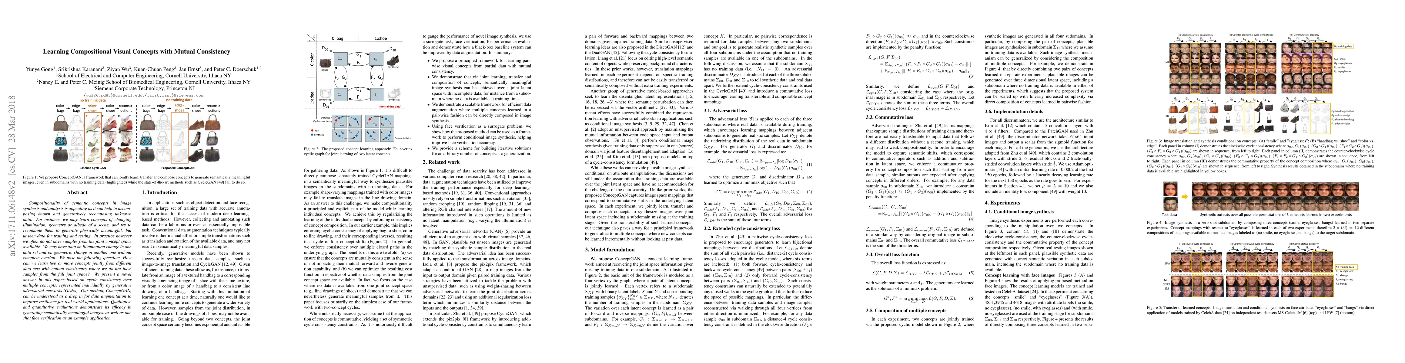 Compositionality of semantic concepts in image synthesis and analysis is appealing as it can help in decomposing known and generatively recomposing unknown data. For instance, we may learn concepts of changing illumination, geometry or albedo of a scene, and try to recombine them to generate physically meaningful, but unseen data for training and testing. In practice however we often do not have samples from the joint concept space available: We may have data on illumination change in one data set and on geometric change in another one without complete overlap. We pose the following question: How can we learn two or more concepts jointly from different data sets with mutual consistency where we do not have samples from the full joint space? We present a novel answer in this paper based on cyclic consistency over multiple concepts, represented individually by generative adversarial networks (GANs). Our method, ConceptGAN, can be understood as a drop in for data augmentation to improve resilience for real world applications. Qualitative and quantitative evaluations demonstrate its efficacy in generating semantically meaningful images, as well as one shot face verification as an example application.