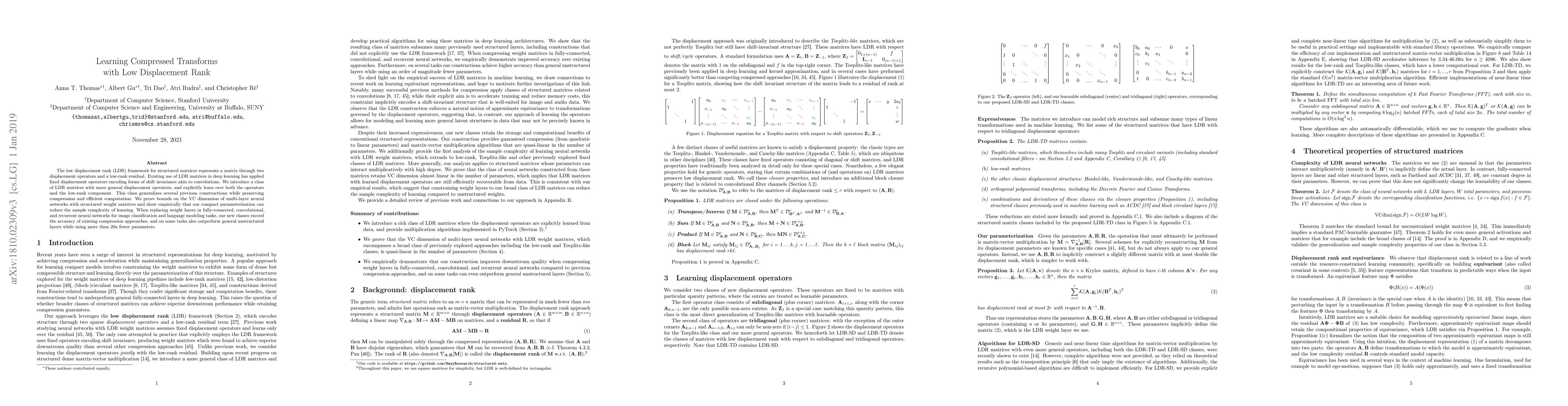 The low displacement rank (LDR) framework for structured matrices represents a matrix through two displacement operators and a low-rank residual. Existing use of LDR matrices in deep learning has applied fixed displacement operators encoding forms of shift invariance akin to convolutions. We introduce a class of LDR matrices with more general displacement operators, and explicitly learn over both the operators and the low-rank component. This class generalizes several previous constructions while preserving compression and efficient computation. We prove bounds on the VC dimension of multi-layer neural networks with structured weight matrices and show empirically that our compact parameterization can reduce the sample complexity of learning. When replacing weight layers in fully-connected, convolutional, and recurrent neural networks for image classification and language modeling tasks, our new classes exceed the accuracy of existing compression approaches, and on some tasks also outperform general unstructured layers while using more than 20x fewer parameters.