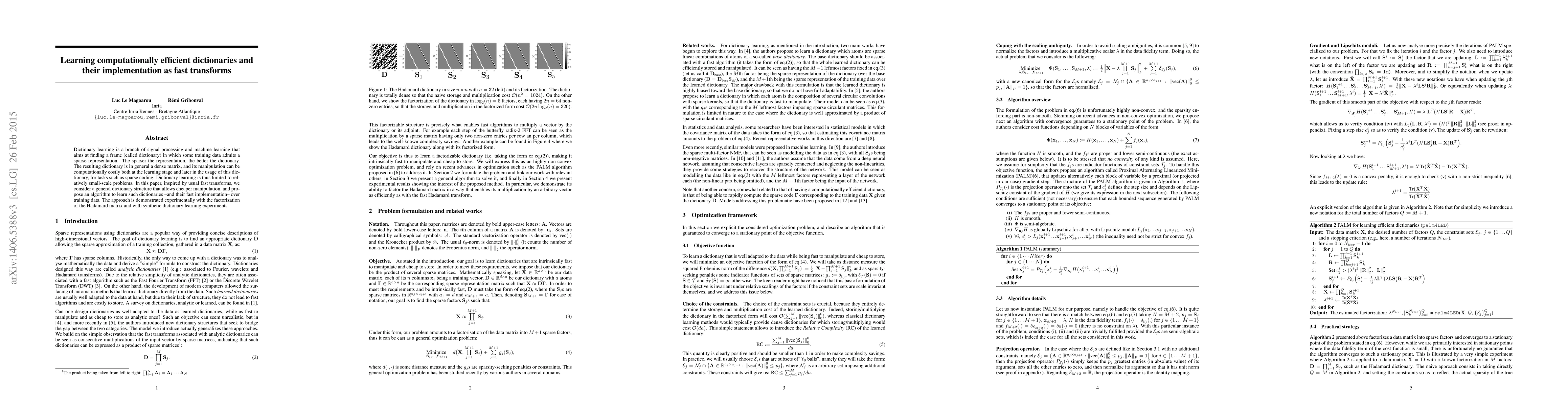 This paper introduces a computationally efficient dictionary learning method, inspired by fast transforms, that reduces manipulation costs. The proposed algorithm learns dictionaries over training data and demonstrates its effectiveness via Hadamard matrix factorization and synthetic experiments.