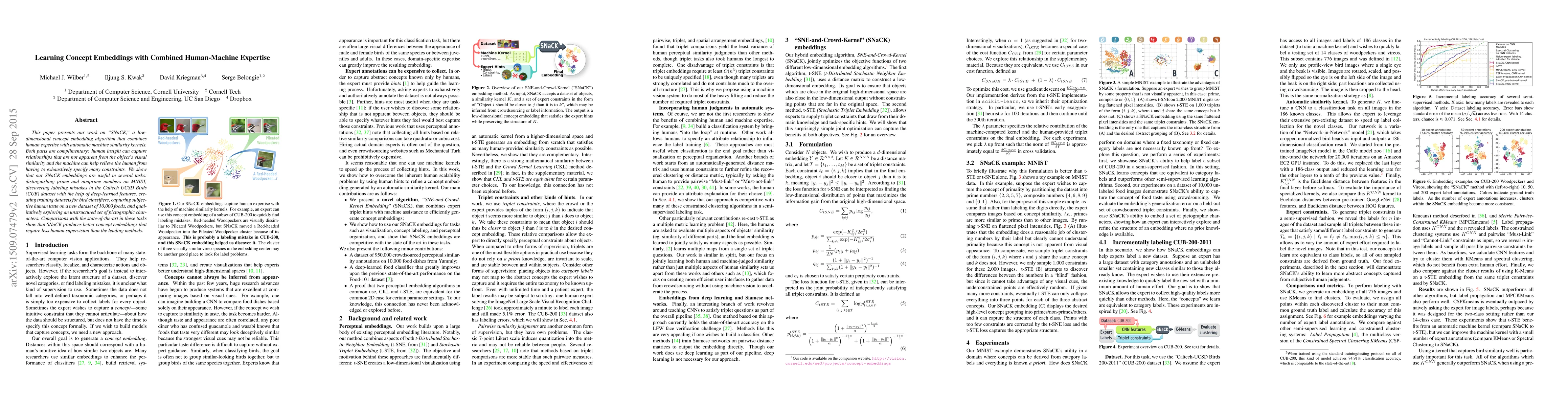 This paper presents our work on "SNaCK," a low-dimensional concept embedding algorithm that combines human expertise with automatic machine similarity kernels. Both parts are complimentary: human insight can capture relationships that are not apparent from the object's visual similarity and the machine can help relieve the human from having to exhaustively specify many constraints. We show that our SNaCK embeddings are useful in several tasks: distinguishing prime and nonprime numbers on MNIST, discovering labeling mistakes in the Caltech UCSD Birds (CUB) dataset with the help of deep-learned features, creating training datasets for bird classifiers, capturing subjective human taste on a new dataset of 10,000 foods, and qualitatively exploring an unstructured set of pictographic characters. Comparisons with the state-of-the-art in these tasks show that SNaCK produces better concept embeddings that require less human supervision than the leading methods.
