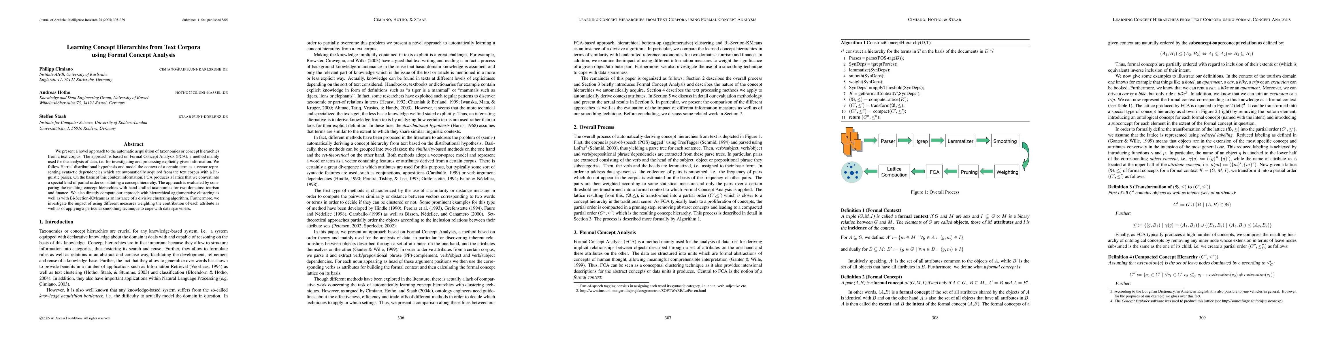 We present a novel approach to the automatic acquisition of taxonomies or concept hierarchies from a text corpus. The approach is based on Formal Concept Analysis (FCA), a method mainly used for the analysis of data, i.e. for investigating and processing explicitly given information. We follow Harris distributional hypothesis and model the context of a certain term as a vector representing syntactic dependencies which are automatically acquired from the text corpus with a linguistic parser. On the basis of this context information, FCA produces a lattice that we convert into a special kind of partial order constituting a concept hierarchy. The approach is evaluated by comparing the resulting concept hierarchies with hand-crafted taxonomies for two domains: tourism and finance. We also directly compare our approach with hierarchical agglomerative clustering as well as with Bi-Section-KMeans as an instance of a divisive clustering algorithm. Furthermore, we investigate the impact of using different measures weighting the contribution of each attribute as well as of applying a particular smoothing technique to cope with data sparseness.