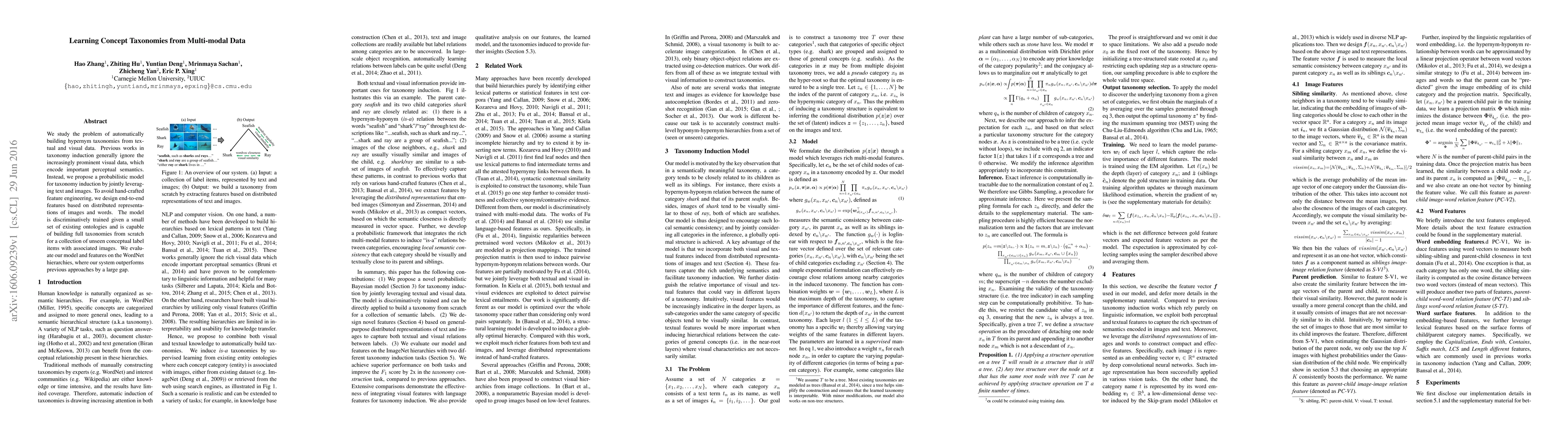 We study the problem of automatically building hypernym taxonomies from textual and visual data. Previous works in taxonomy induction generally ignore the increasingly prominent visual data, which encode important perceptual semantics. Instead, we propose a probabilistic model for taxonomy induction by jointly leveraging text and images. To avoid hand-crafted feature engineering, we design end-to-end features based on distributed representations of images and words. The model is discriminatively trained given a small set of existing ontologies and is capable of building full taxonomies from scratch for a collection of unseen conceptual label items with associated images. We evaluate our model and features on the WordNet hierarchies, where our system outperforms previous approaches by a large gap.