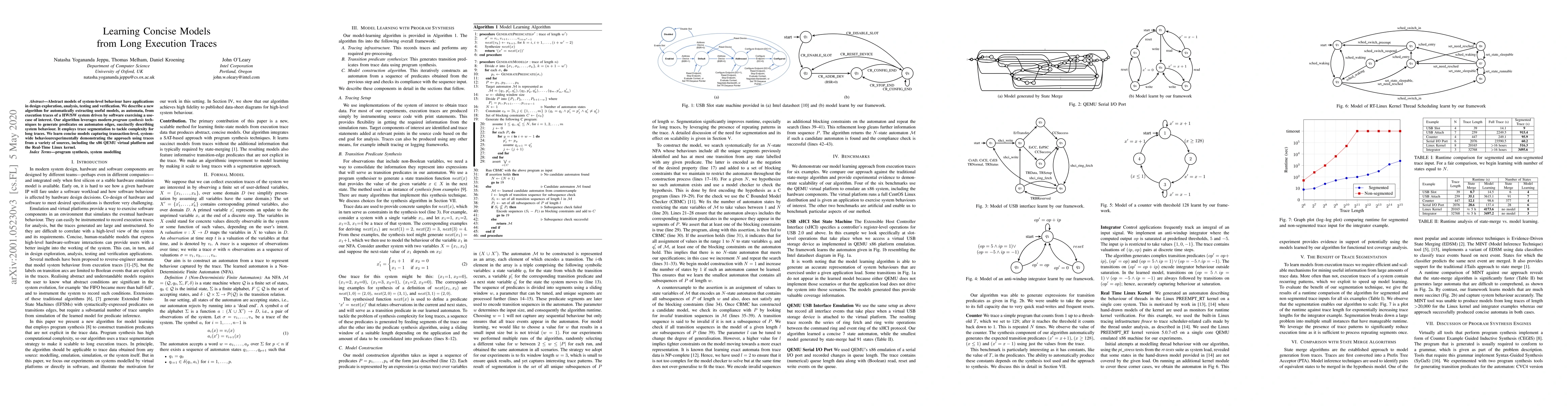 Abstract models of system-level behaviour have applications in design exploration, analysis, testing and verification. We describe a new algorithm for automatically extracting useful models, as automata, from execution traces of a HW/SW system driven by software exercising a use-case of interest. Our algorithm leverages modern program synthesis techniques to generate predicates on automaton edges, succinctly describing system behaviour. It employs trace segmentation to tackle complexity for long traces. We learn concise models capturing transaction-level, system-wide behaviour--experimentally demonstrating the approach using traces from a variety of sources, including the x86 QEMU virtual platform and the Real-Time Linux kernel.