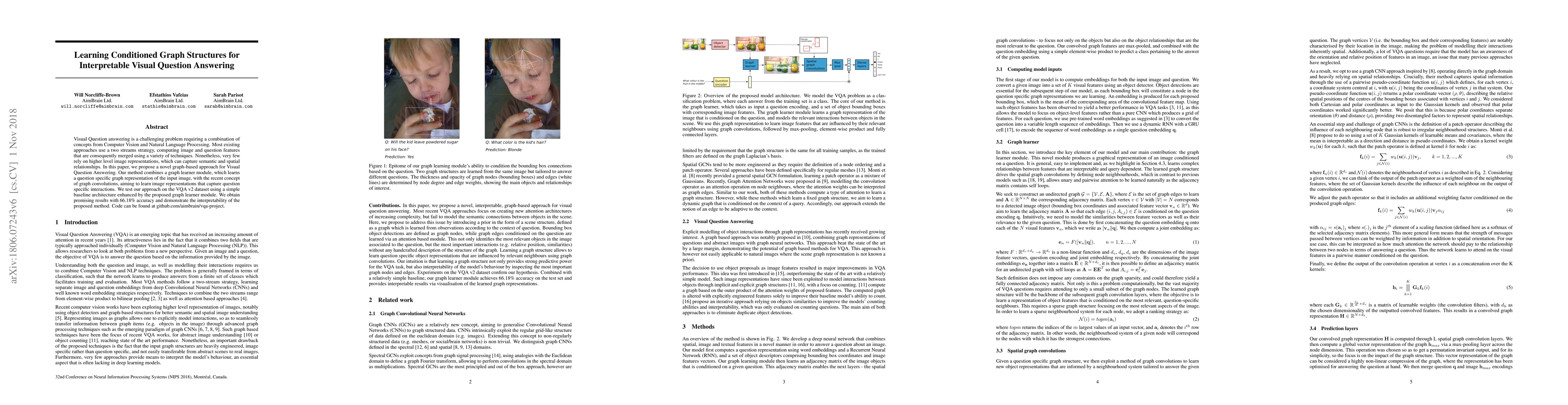 Visual Question answering is a challenging problem requiring a combination of concepts from Computer Vision and Natural Language Processing. Most existing approaches use a two streams strategy, computing image and question features that are consequently merged using a variety of techniques. Nonetheless, very few rely on higher level image representations, which can capture semantic and spatial relationships. In this paper, we propose a novel graph-based approach for Visual Question Answering. Our method combines a graph learner module, which learns a question specific graph representation of the input image, with the recent concept of graph convolutions, aiming to learn image representations that capture question specific interactions. We test our approach on the VQA v2 dataset using a simple baseline architecture enhanced by the proposed graph learner module. We obtain promising results with 66.18% accuracy and demonstrate the interpretability of the proposed method. Code can be found at github.com/aimbrain/vqa-project.
