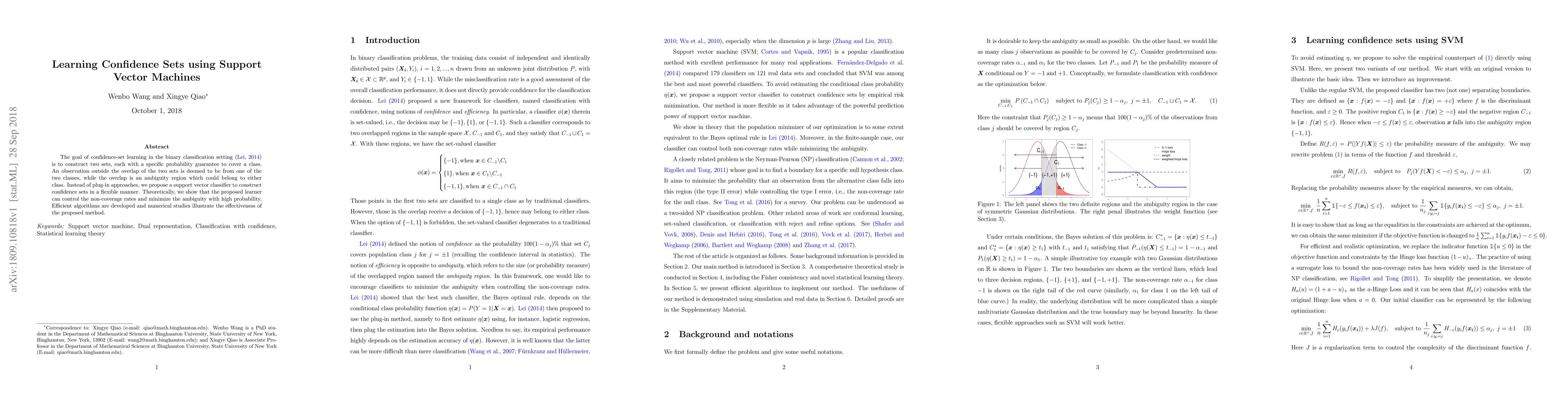 This paper proposes using support vector classifiers to construct confidence sets in binary classification, offering a flexible method to control non-coverage rates and minimize ambiguity. Theoretical analysis and numerical studies demonstrate the effectiveness of the proposed approach.