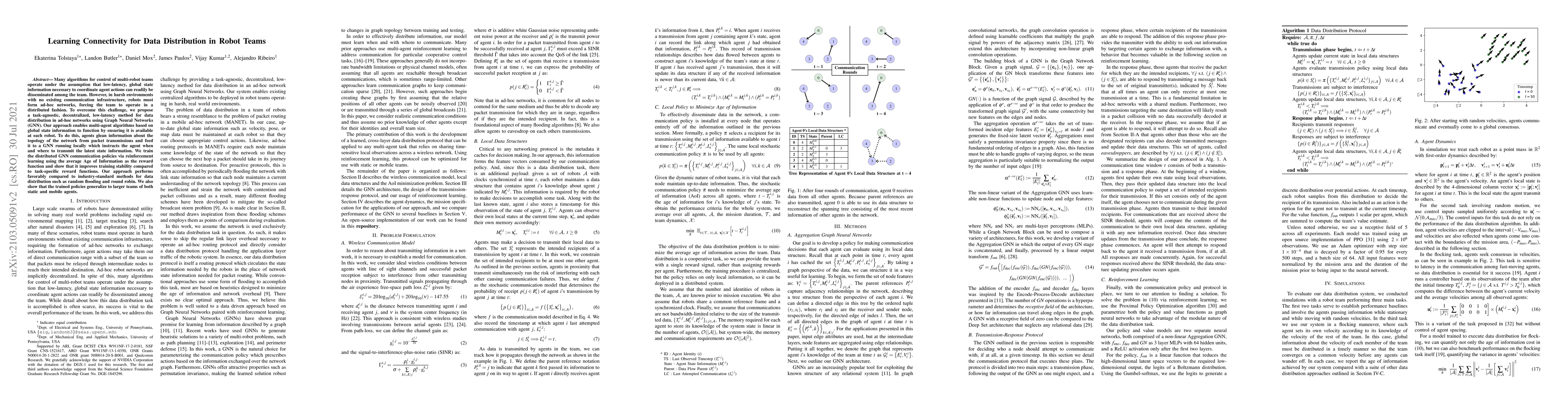 This paper proposes a decentralized, low-latency method for data distribution in multi-robot teams operating in ad-hoc networks using Graph Neural Networks (GNN). The approach trains distributed GNN communication policies via reinforcement learning to ensure global state information is available at each robot, improving training stability and outperforming standard methods.