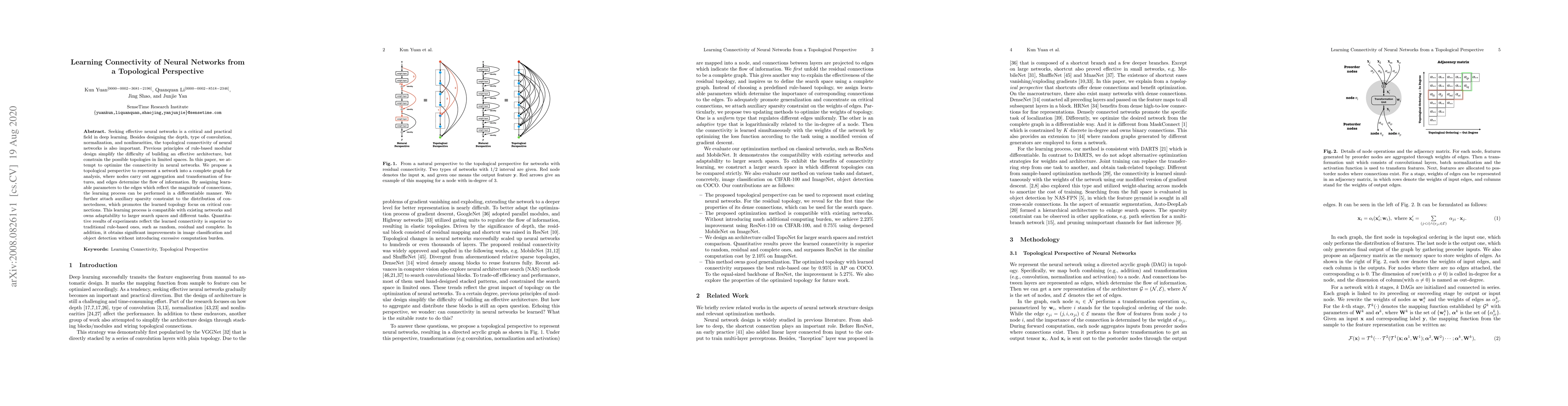 Seeking effective neural networks is a critical and practical field in deep learning. Besides designing the depth, type of convolution, normalization, and nonlinearities, the topological connectivity of neural networks is also important. Previous principles of rule-based modular design simplify the difficulty of building an effective architecture, but constrain the possible topologies in limited spaces. In this paper, we attempt to optimize the connectivity in neural networks. We propose a topological perspective to represent a network into a complete graph for analysis, where nodes carry out aggregation and transformation of features, and edges determine the flow of information. By assigning learnable parameters to the edges which reflect the magnitude of connections, the learning process can be performed in a differentiable manner. We further attach auxiliary sparsity constraint to the distribution of connectedness, which promotes the learned topology focus on critical connections. This learning process is compatible with existing networks and owns adaptability to larger search spaces and different tasks. Quantitative results of experiments reflect the learned connectivity is superior to traditional rule-based ones, such as random, residual, and complete. In addition, it obtains significant improvements in image classification and object detection without introducing excessive computation burden.