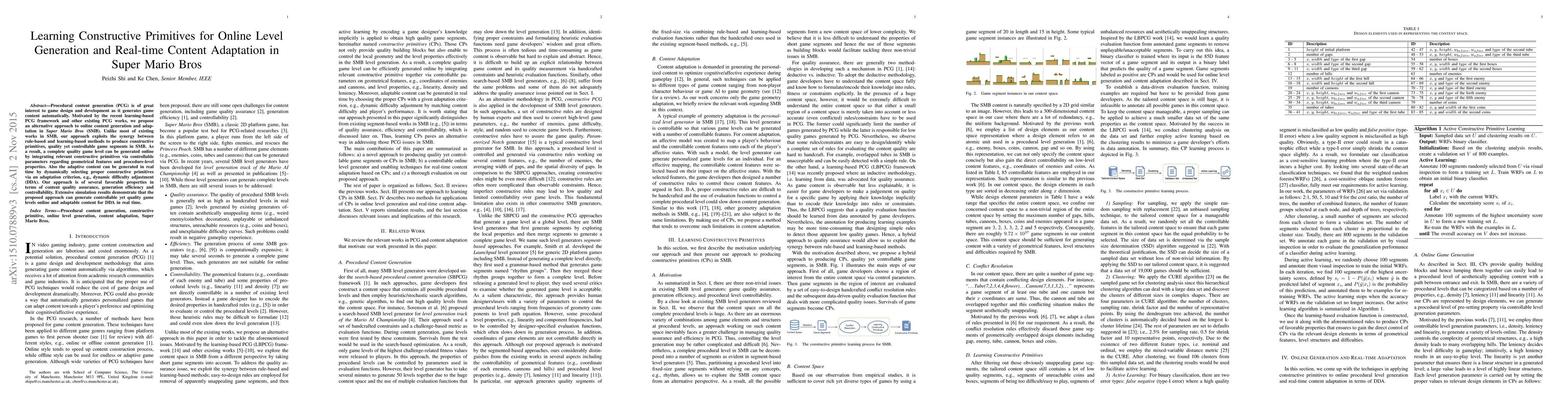 This paper proposes a hybrid method combining rule-based and learning-based techniques for procedural content generation in Super Mario Bros, creating constructive primitives for online level generation and real-time content adaptation, demonstrating high-quality, controllable, and efficient game level production and dynamic difficulty adjustment.