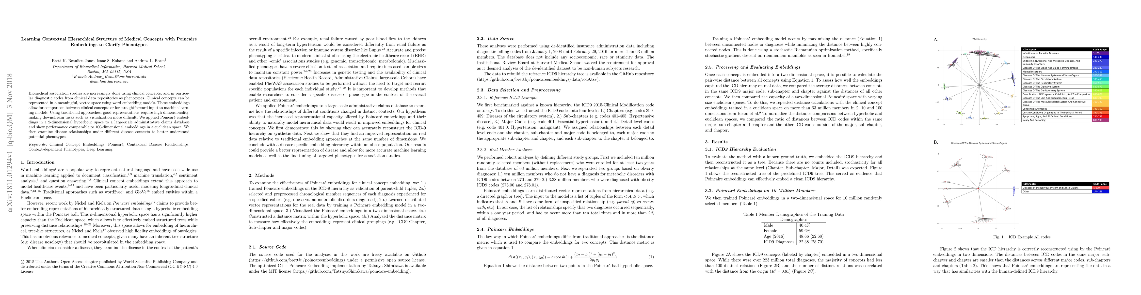 Biomedical association studies are increasingly done using clinical concepts, and in particular diagnostic codes from clinical data repositories as phenotypes. Clinical concepts can be represented in a meaningful, vector space using word embedding models. These embeddings allow for comparison between clinical concepts or for straightforward input to machine learning models. Using traditional approaches, good representations require high dimensionality, making downstream tasks such as visualization more difficult. We applied Poincar\'e embeddings in a 2-dimensional hyperbolic space to a large-scale administrative claims database and show performance comparable to 100-dimensional embeddings in a euclidean space. We then examine disease relationships under different disease contexts to better understand potential phenotypes.