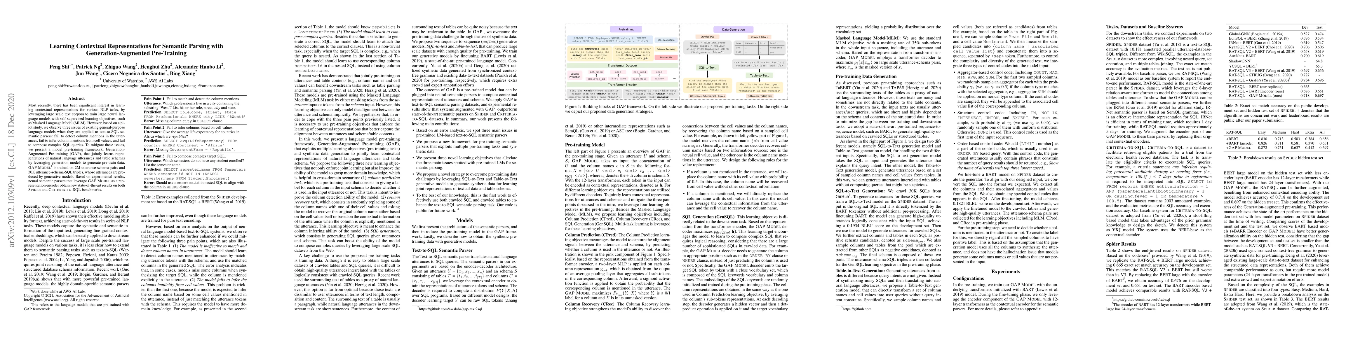 This paper introduces Generation-Augmented Pre-training (GAP MODEL) to improve contextual representations for text-to-SQL semantic parsing, addressing issues in general-purpose language models. It achieves state-of-the-art results on benchmark datasets by pre-training on generated utterance-schema pairs and triples.
