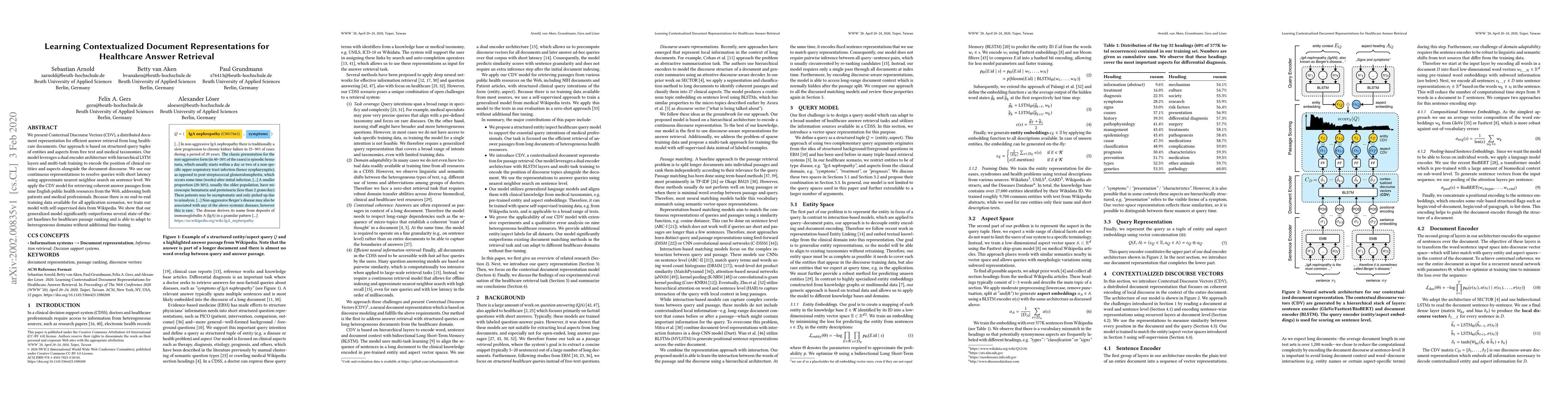 The paper introduces Contextual Discourse Vectors (CDV), a method for efficient retrieval of answers from lengthy healthcare documents using structured query tuples. CDV employs a dual encoder with hierarchical LSTM layers and multi-task training to encode entity and aspect positions within documents. It outperforms baseline models in healthcare passage ranking, adapting to various domains without fine-tuning, trained on self-supervised Wikipedia data for lack of end-to-end training data across all scenarios.