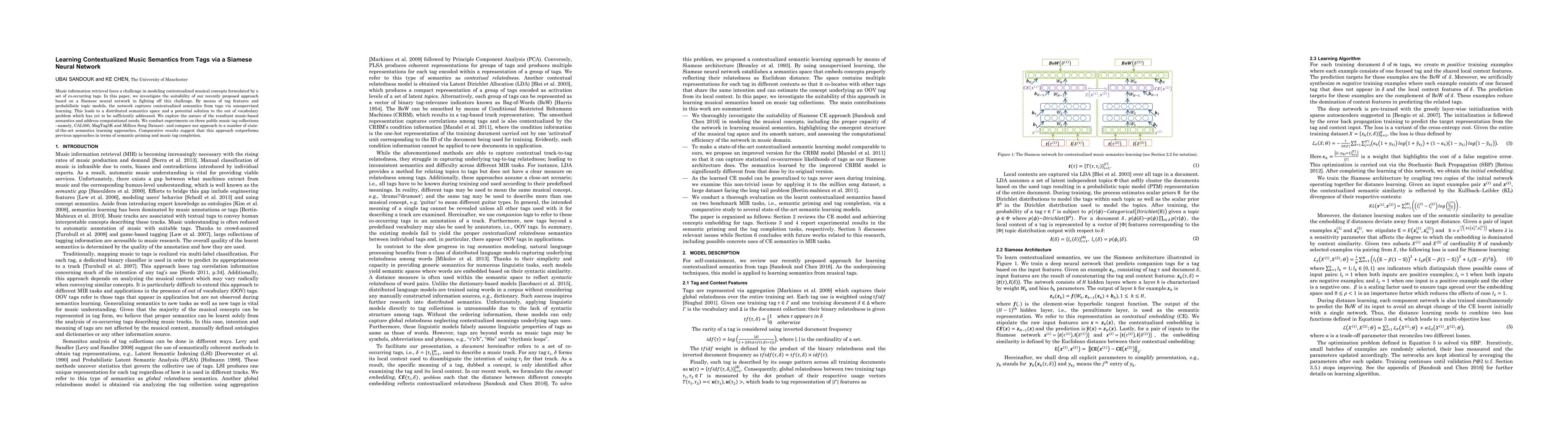 This paper proposes a Siamese neural network to model contextualized musical semantics from co-occurring tags, addressing the out-of-vocabulary problem through unsupervised learning. Experiments on three music tag datasets show superior performance in semantic priming and tag completion compared to state-of-the-art methods.