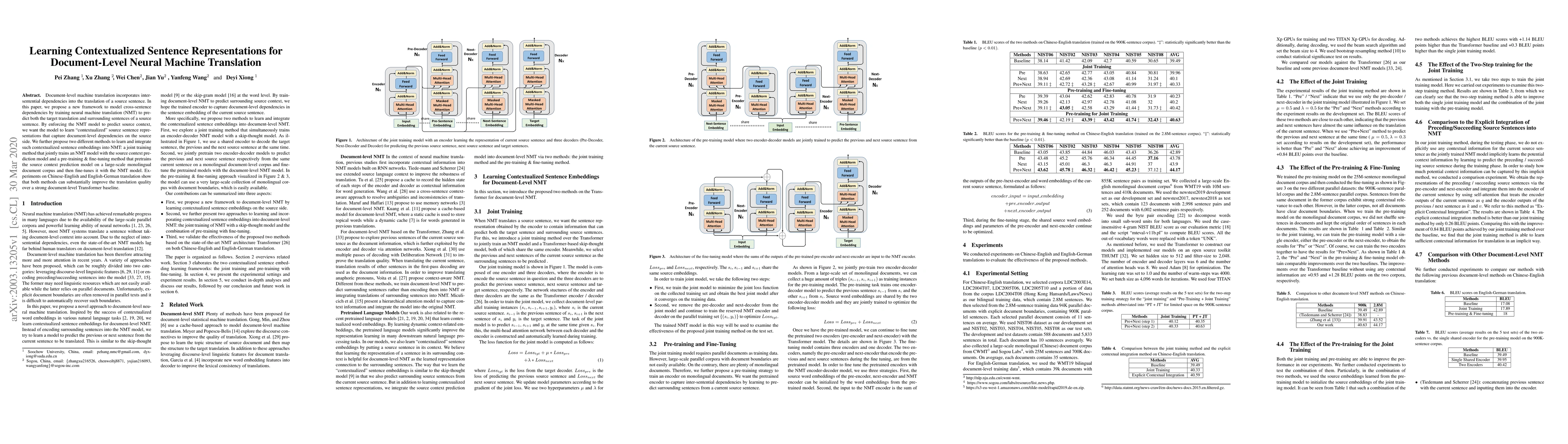 This paper proposes a framework to enhance document-level neural machine translation (NMT) by modeling cross-sentence dependencies through predicting both target translations and surrounding source sentences, thus learning contextualized sentence representations. Two methods—joint training and pre-training & fine-tuning—are evaluated, showing improved translation quality over baseline models.