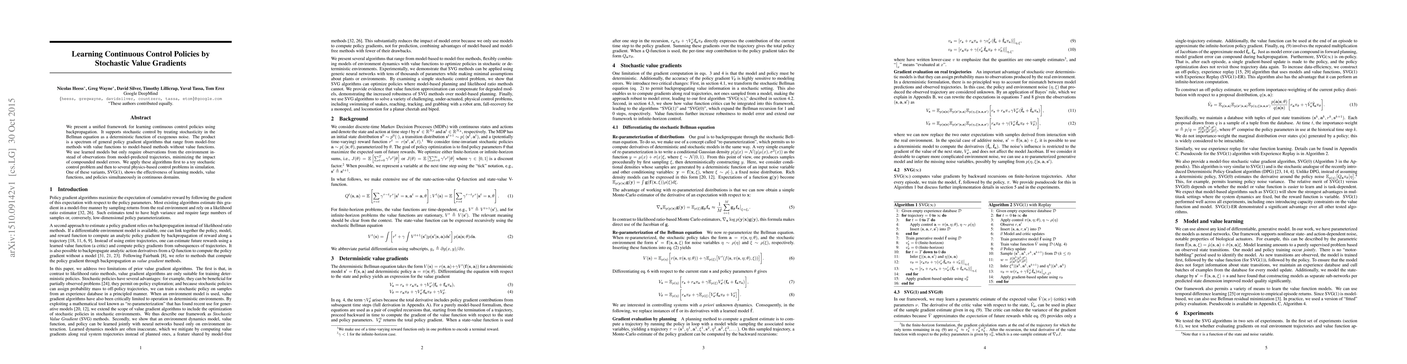 This paper introduces a unified framework for continuous control policy learning via stochastic value gradients, employing backpropagation and treating stochasticity in the Bellman equation as a deterministic function of noise. The approach minimizes compounded model errors by using only observed environment data, and it demonstrates effectiveness through various simulation-based control problems.