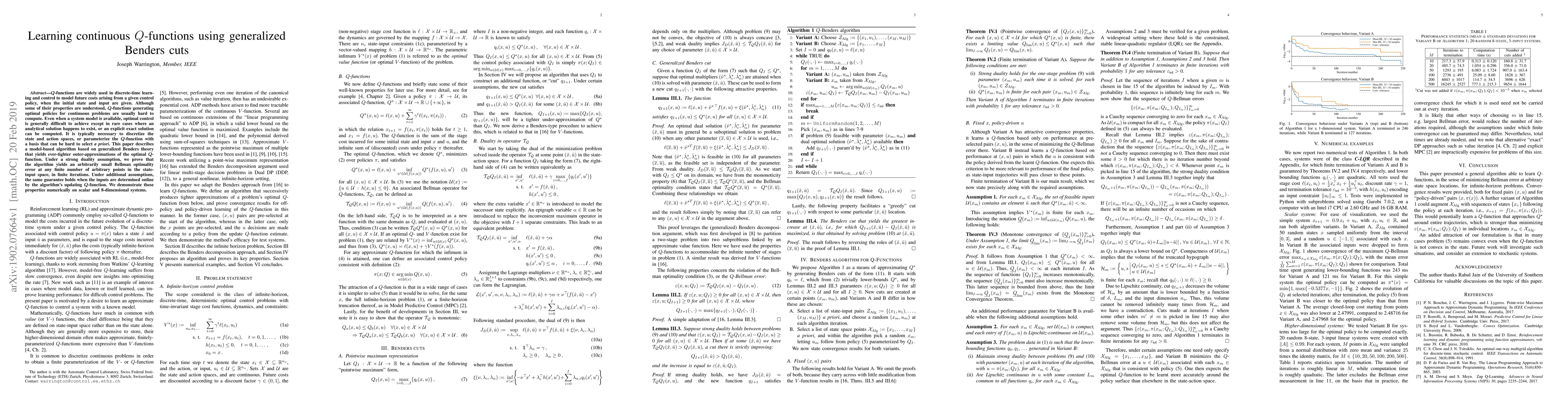 Q-functions are widely used in discrete-time learning and control to model future costs arising from a given control policy, when the initial state and input are given. Although some of their properties are understood, Q-functions generating optimal policies for continuous problems are usually hard to compute. Even when a system model is available, optimal control is generally difficult to achieve except in rare cases where an analytical solution happens to exist, or an explicit exact solution can be computed. It is typically necessary to discretize the state and action spaces, or parameterize the Q-function with a basis that can be hard to select a priori. This paper describes a model-based algorithm based on generalized Benders theory that yields ever-tighter outer-approximations of the optimal Q-function. Under a strong duality assumption, we prove that the algorithm yields an arbitrarily small Bellman optimality error at any finite number of arbitrary points in the state-input space, in finite iterations. Under additional assumptions, the same guarantee holds when the inputs are determined online by the algorithm's updating Q-function. We demonstrate these properties numerically on scalar and 8-dimensional systems.