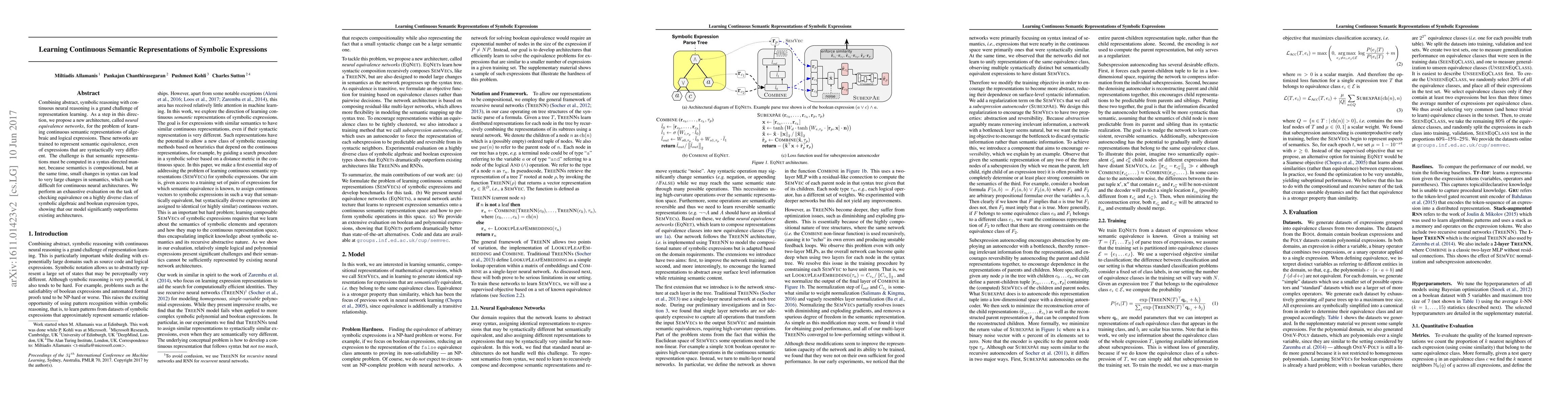 This paper proposes neural equivalence networks to learn continuous semantic representations of algebraic and logical expressions, achieving better performance than existing architectures by representing semantic equivalence across syntactically different expressions. The model addresses the challenge of composing semantics in a syntax-directed manner while handling significant semantic changes from small syntactic variations.