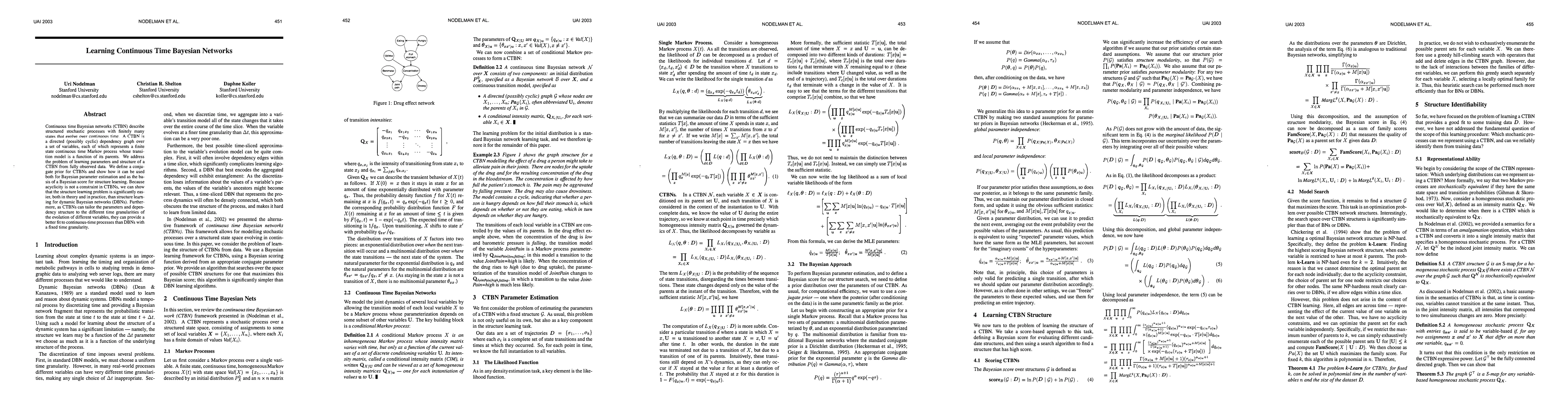 This paper explores learning parameters and structure in continuous time Bayesian networks (CTBNs) from fully observed data, proposing a conjugate prior for effective Bayesian parameter estimation and structure learning. Unlike dynamic Bayesian networks, CTBNs' cyclic nature simplifies structure learning and better accommodates variable-specific time granularities.