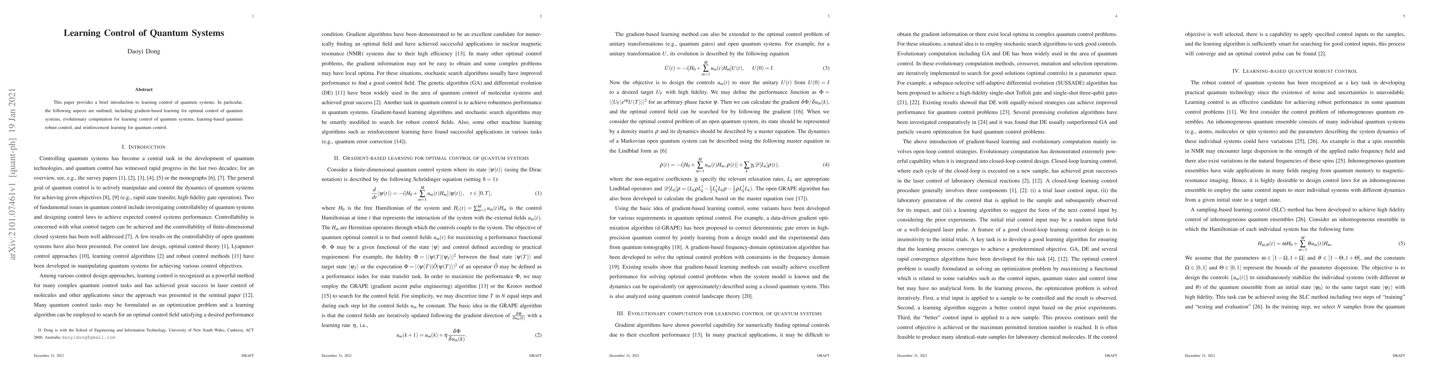 This paper introduces learning control techniques for quantum systems, focusing on gradient-based, evolutionary, robust, and reinforcement learning methods for optimizing and controlling quantum processes.