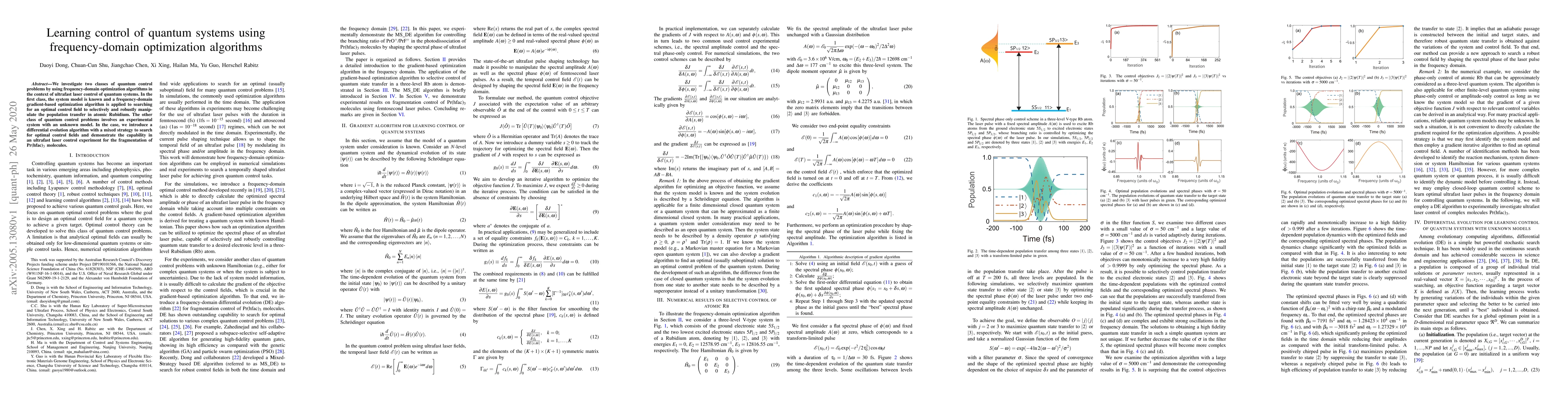 We investigate two classes of quantum control problems by using frequency-domain optimization algorithms in the context of ultrafast laser control of quantum systems. In the first class, the system model is known and a frequency-domain gradient-based optimization algorithm is applied to searching for an optimal control field to selectively and robustly manipulate the population transfer in atomic Rubidium. The other class of quantum control problems involves an experimental system with an unknown model. In the case, we introduce a differential evolution algorithm with a mixed strategy to search for optimal control fields and demonstrate the capability in an ultrafast laser control experiment for the fragmentation of Pr(hfac)$_3$ molecules.