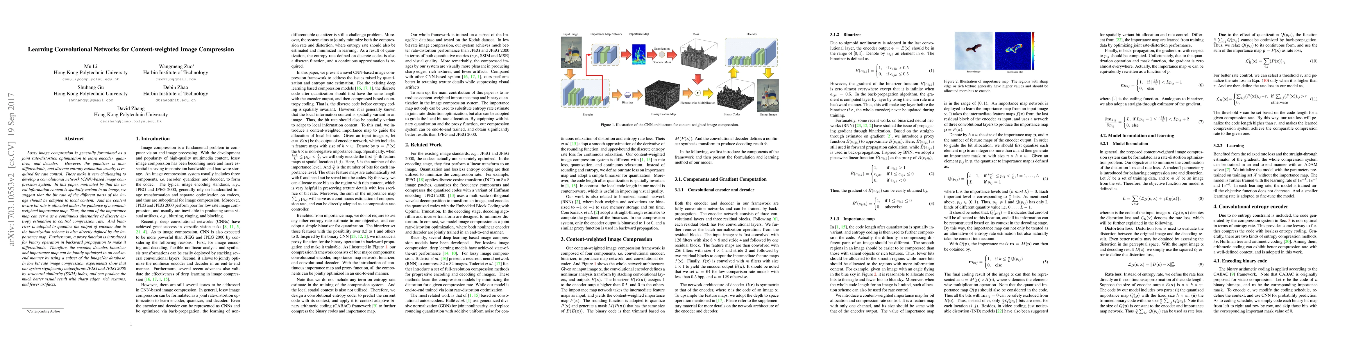 This research proposes a convolutional network-based approach for content-weighted image compression, addressing the challenges posed by the non-differentiability of the quantizer and the need for discrete entropy estimation. The method adapts bit rates to local image content using a content-weighted importance map, enabling end-to-end optimization. Experimental results demonstrate superior performance over JPEG and JPEG 2000 in low bit rate scenarios, with better visual quality and fewer artifacts.