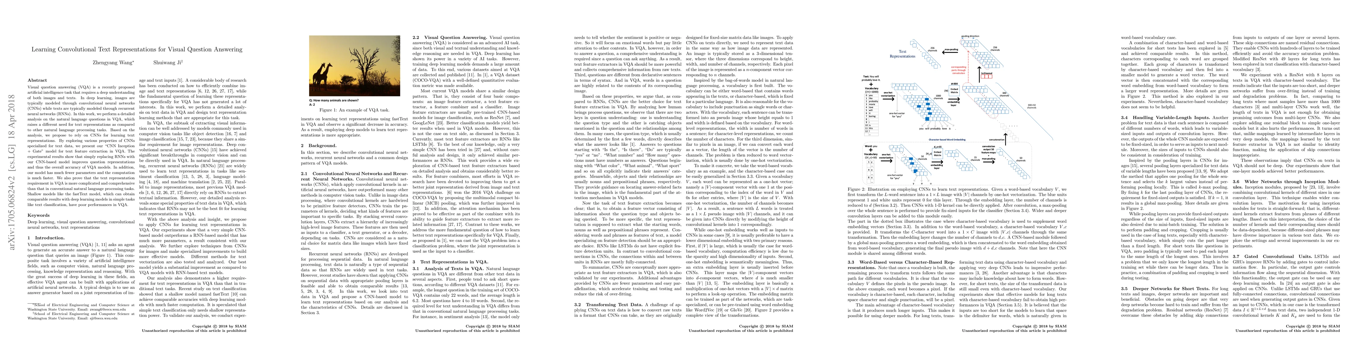 This paper proposes using convolutional neural networks for textual representations in visual question answering, presenting the "CNN Inception + Gate" model that enhances question representation and improves overall accuracy. It argues that visual question answering requires more complex text representations compared to conventional NLP tasks.