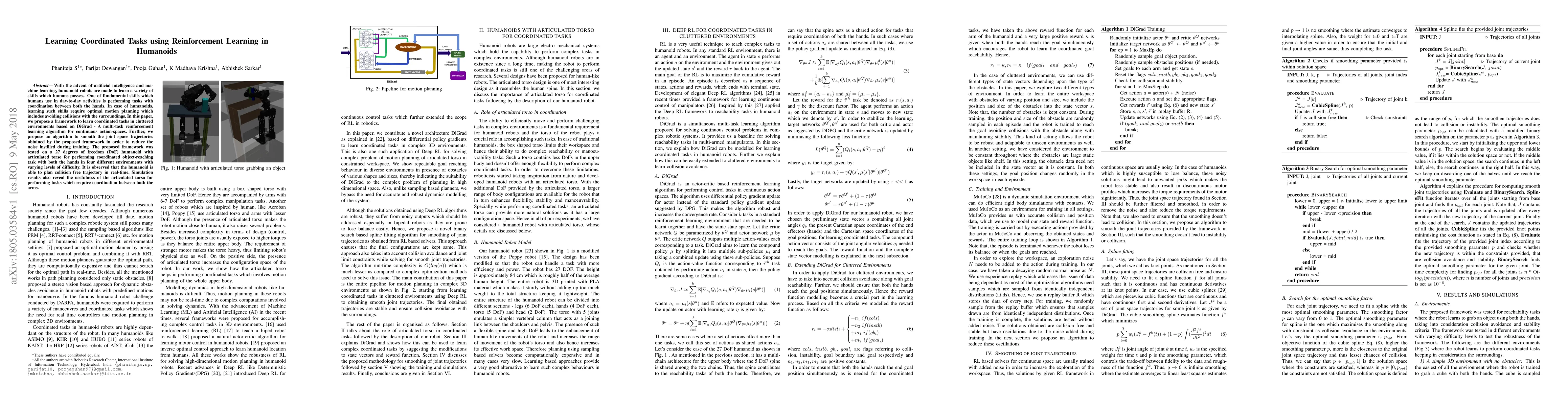 This paper proposes a framework using a multi-task reinforcement learning algorithm called DiGrad to enable humanoid robots to learn coordinated tasks with both hands, including optimal motion planning to avoid collisions. The framework was tested on a 27 DoF humanoid in various cluttered environments, demonstrating real-time collision-free trajectory planning and the utility of an articulated torso.